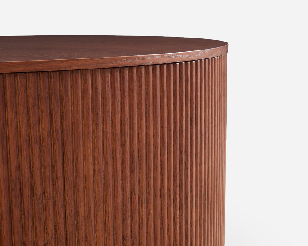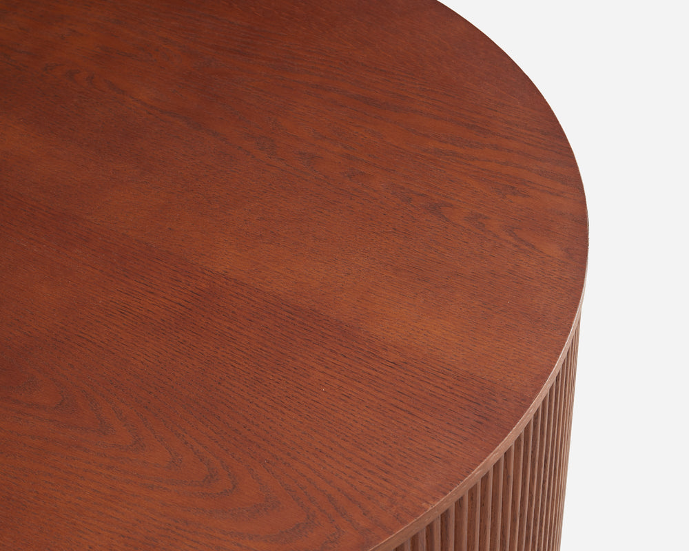 The Esmond Collection is defined by its rhythmic fluted detailing, blending architectural precision with organic warmth. This versatile coffee table features a circular, spacious tabletop that softens the room's corners while serving as a striking visual anchor.