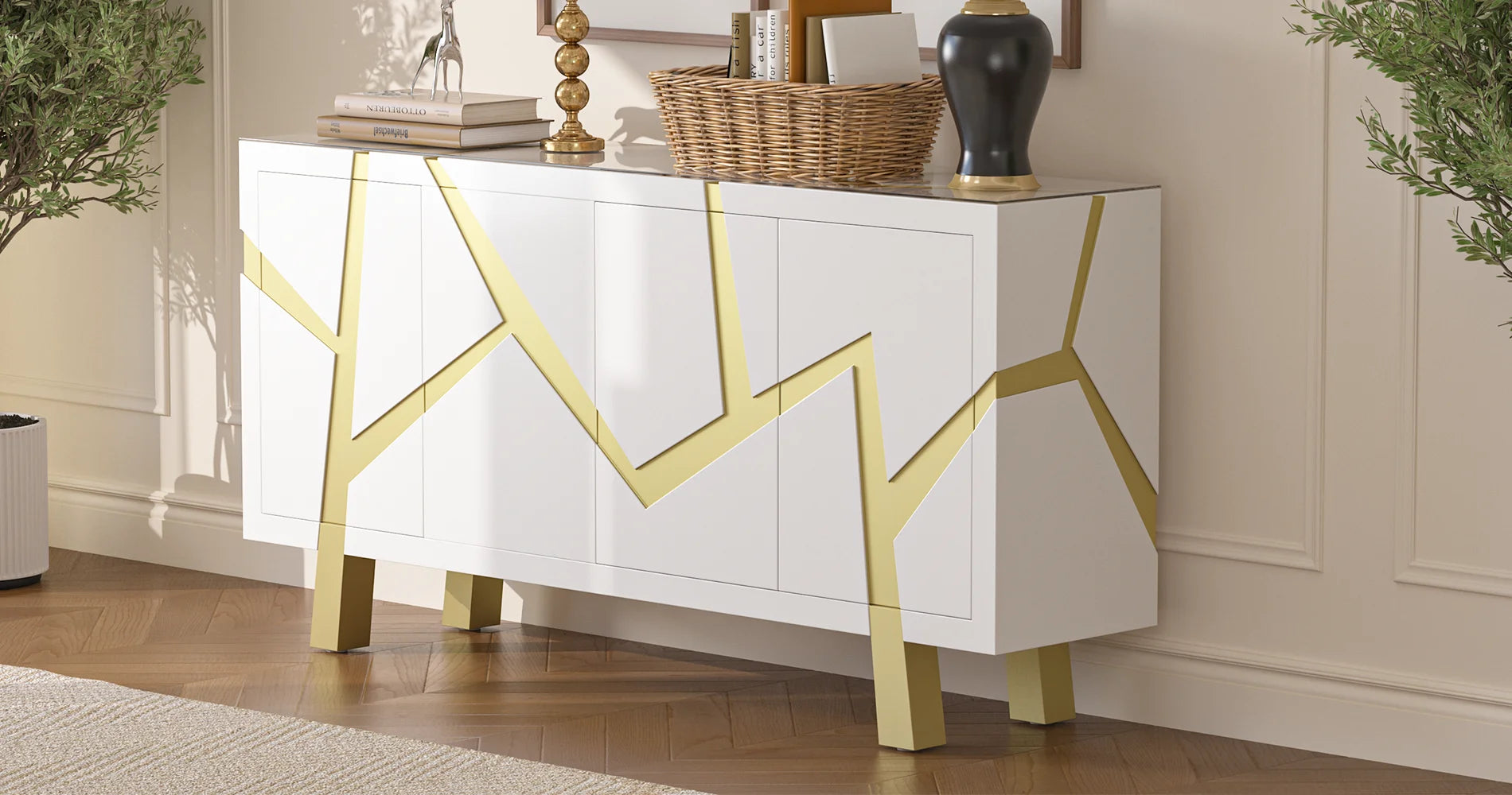 This sideboard features a high-gloss white cabinet body accented with flowing golden ribbon lines, instantly brightening your space. With its four-door, hidden storage design, this piece serves as a dual focal point for both storage and aesthetics, whether placed in a living room or dining area.