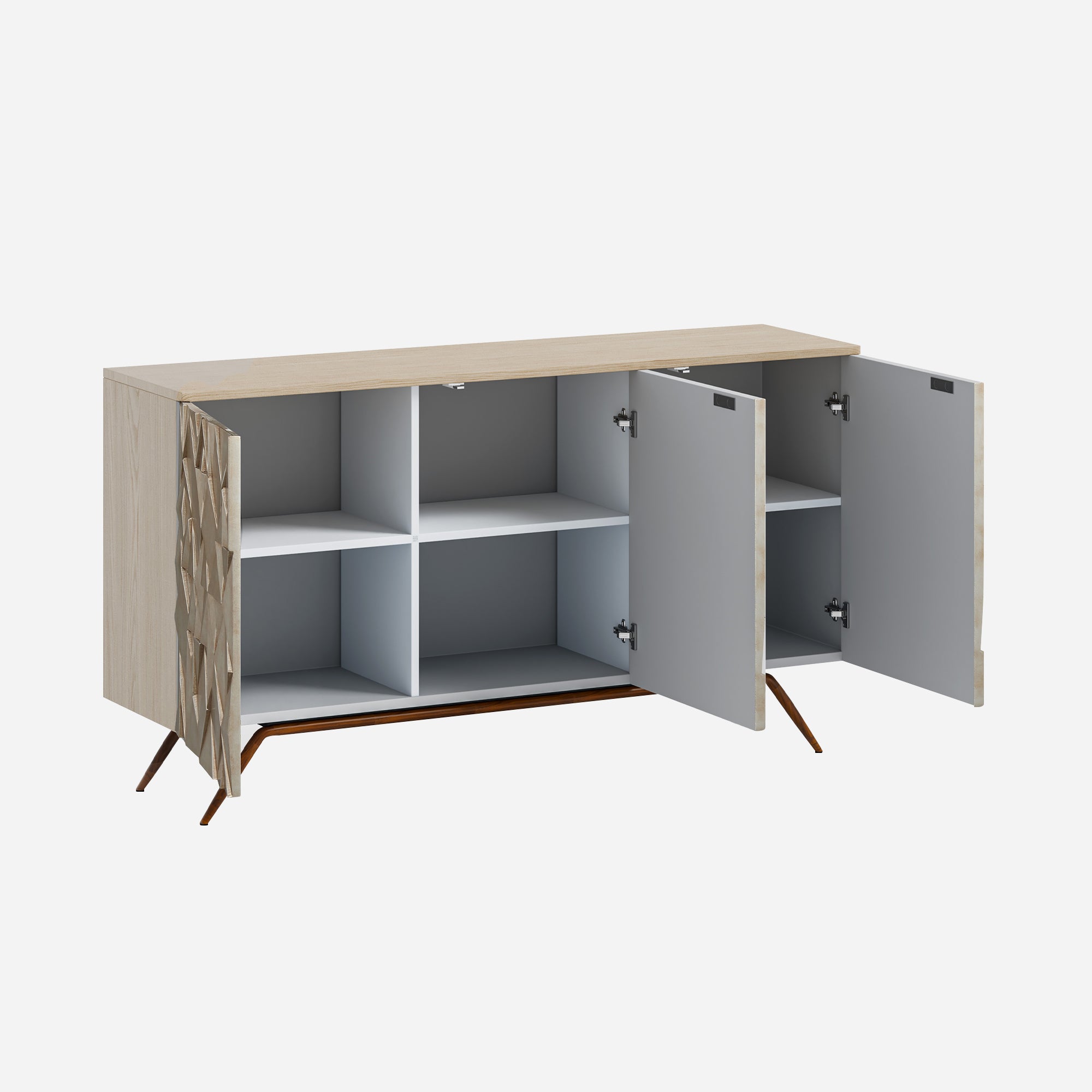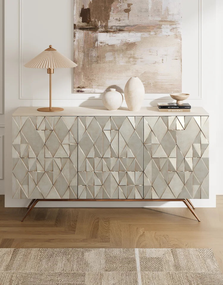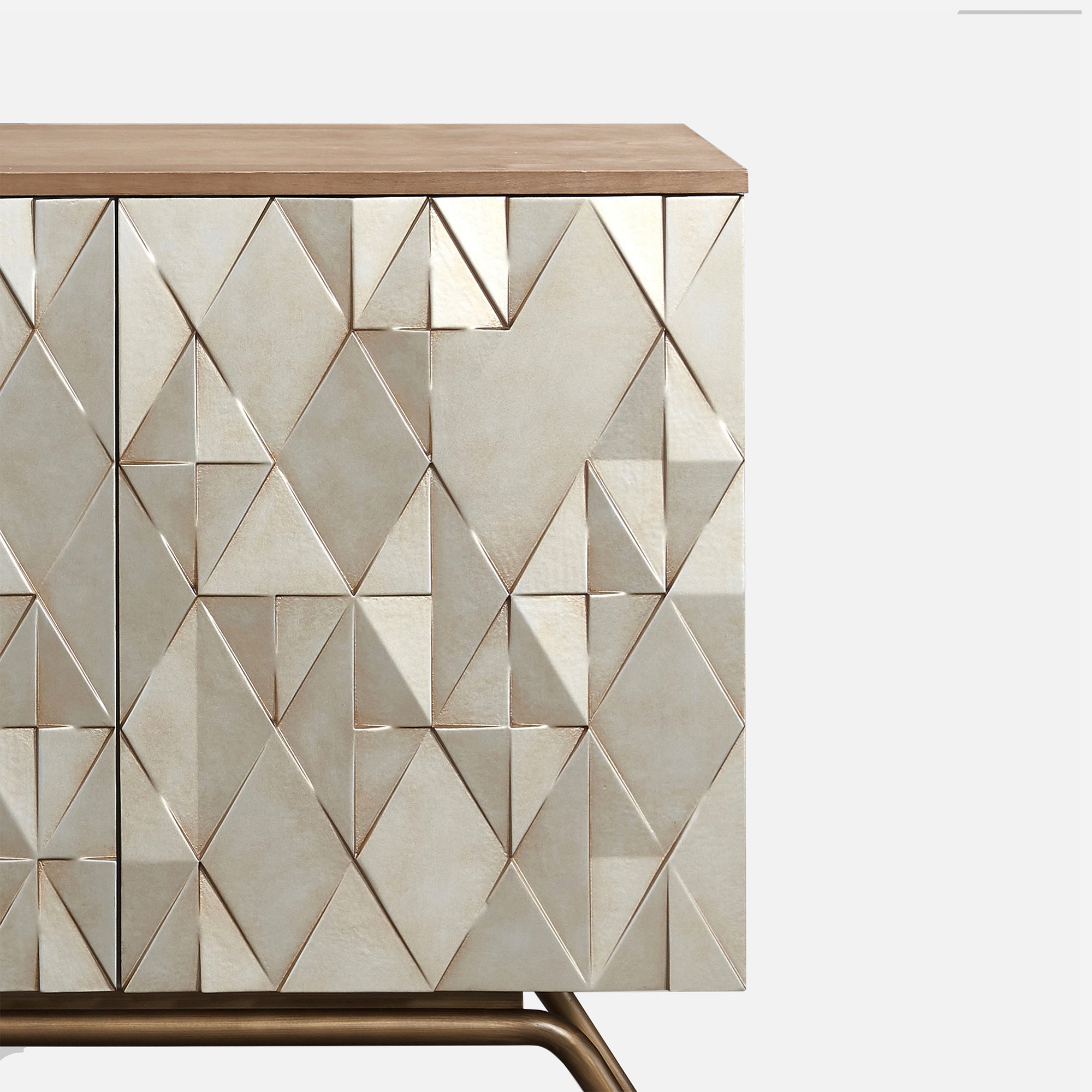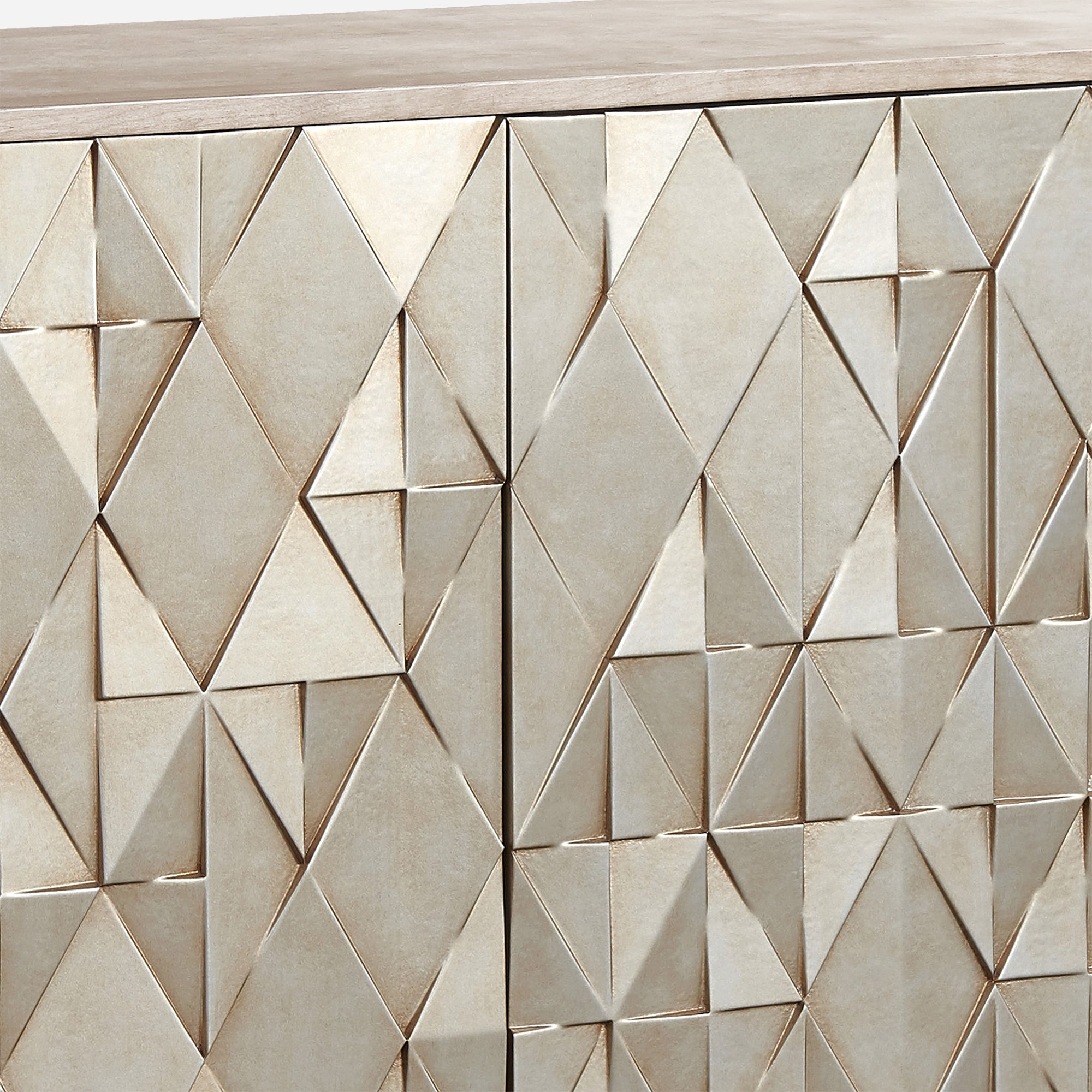 Individual triangular panels wrapped in brass create a striking geometric texture that catches the light from every angle.