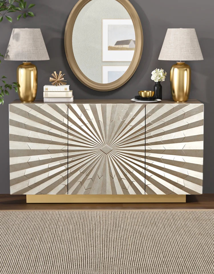 Intricately carved with radiating geometric patterns, the doors add a refined artistic touch that elevates any dining or living space.