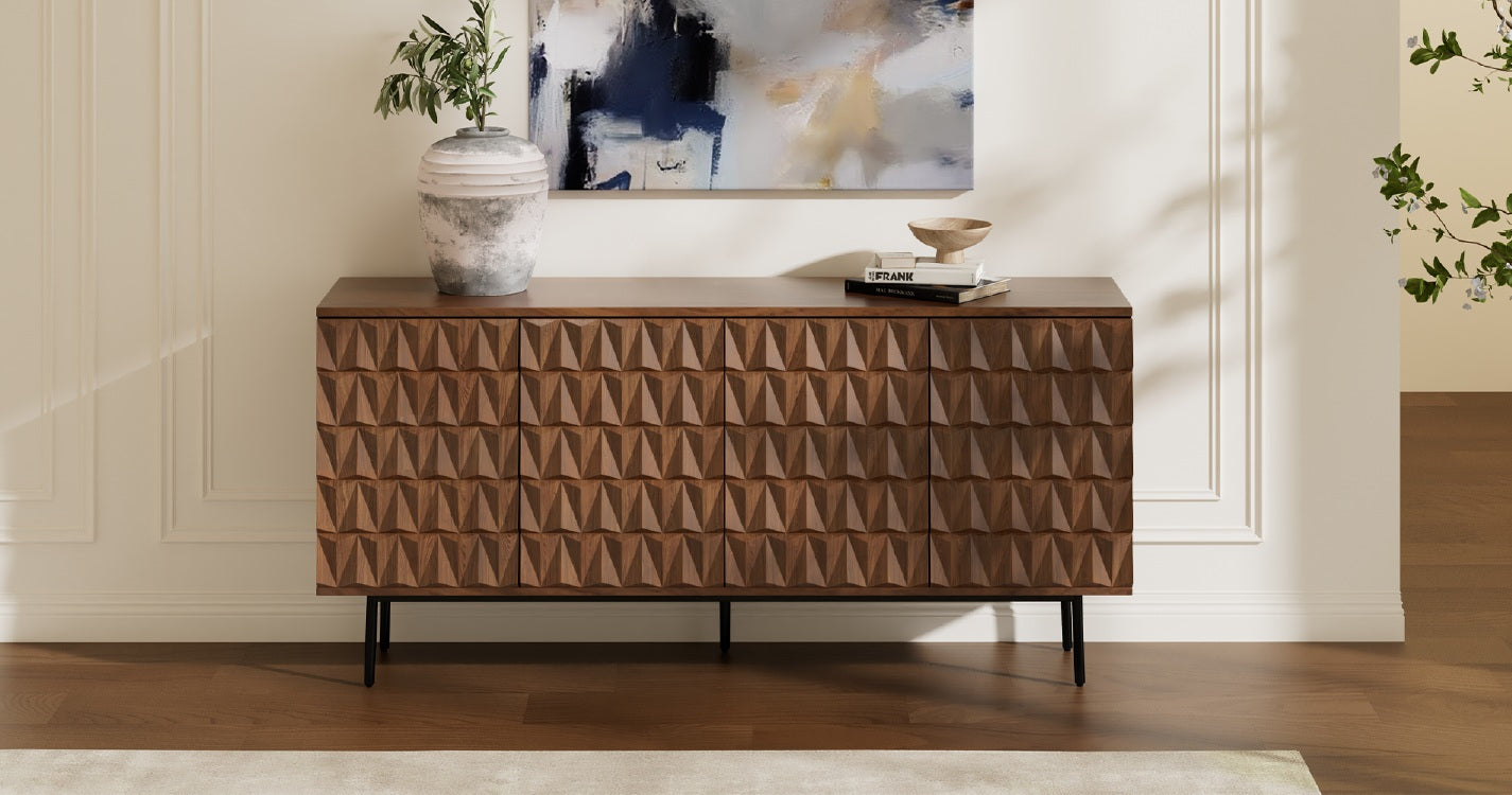 Carved wood, rich veneer, bold metal — storage redefined as design.
