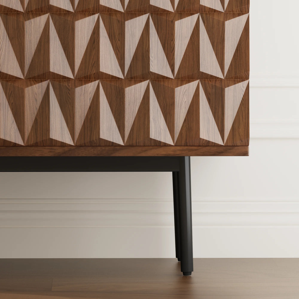 Defined by bold carved patterns and rich wood veneer that highlight the natural grain, creating a striking balance of craftsmanship and modern warmth.