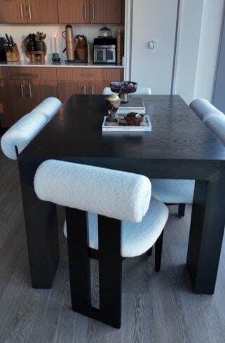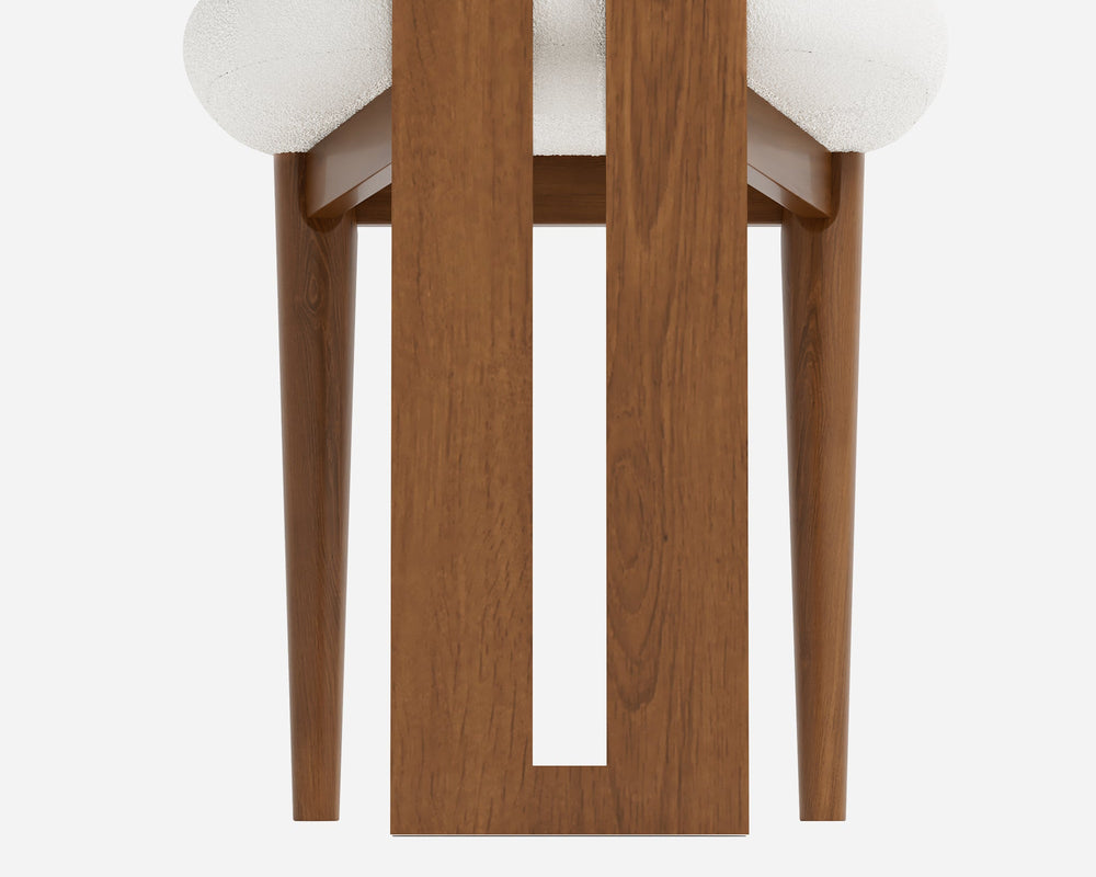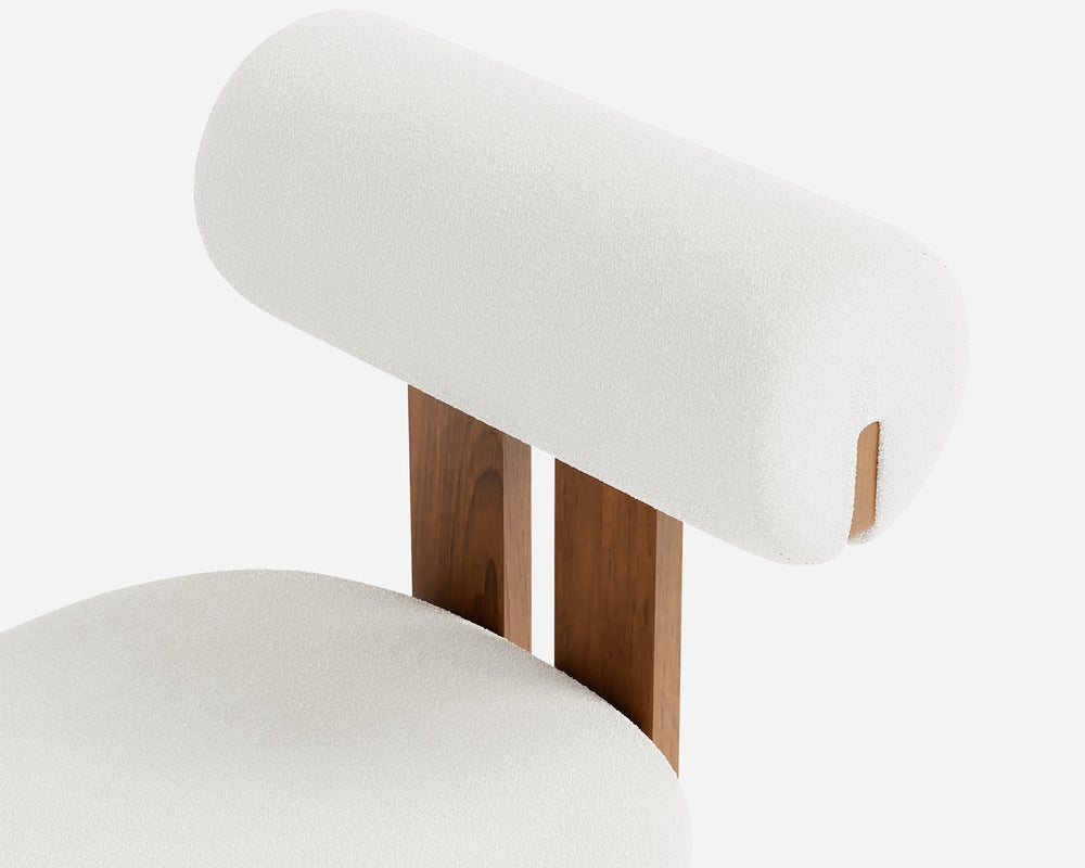 The Woce Dining Chair reimagines modern seating with a distinctive cylindrical backrest and a geometric solid wood frame. Tailored in premium bouclé fabric, this sculptural piece brings an artistic presence and exceptional comfort to any dining space.
