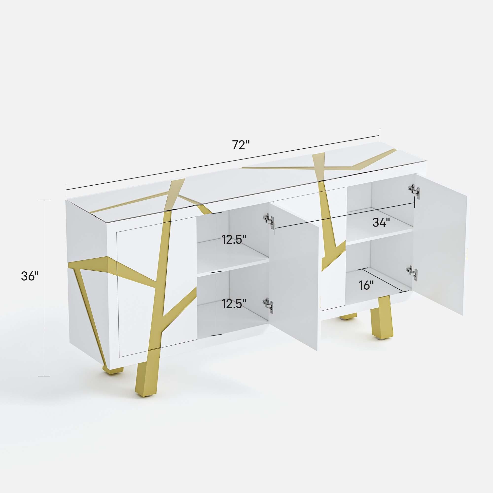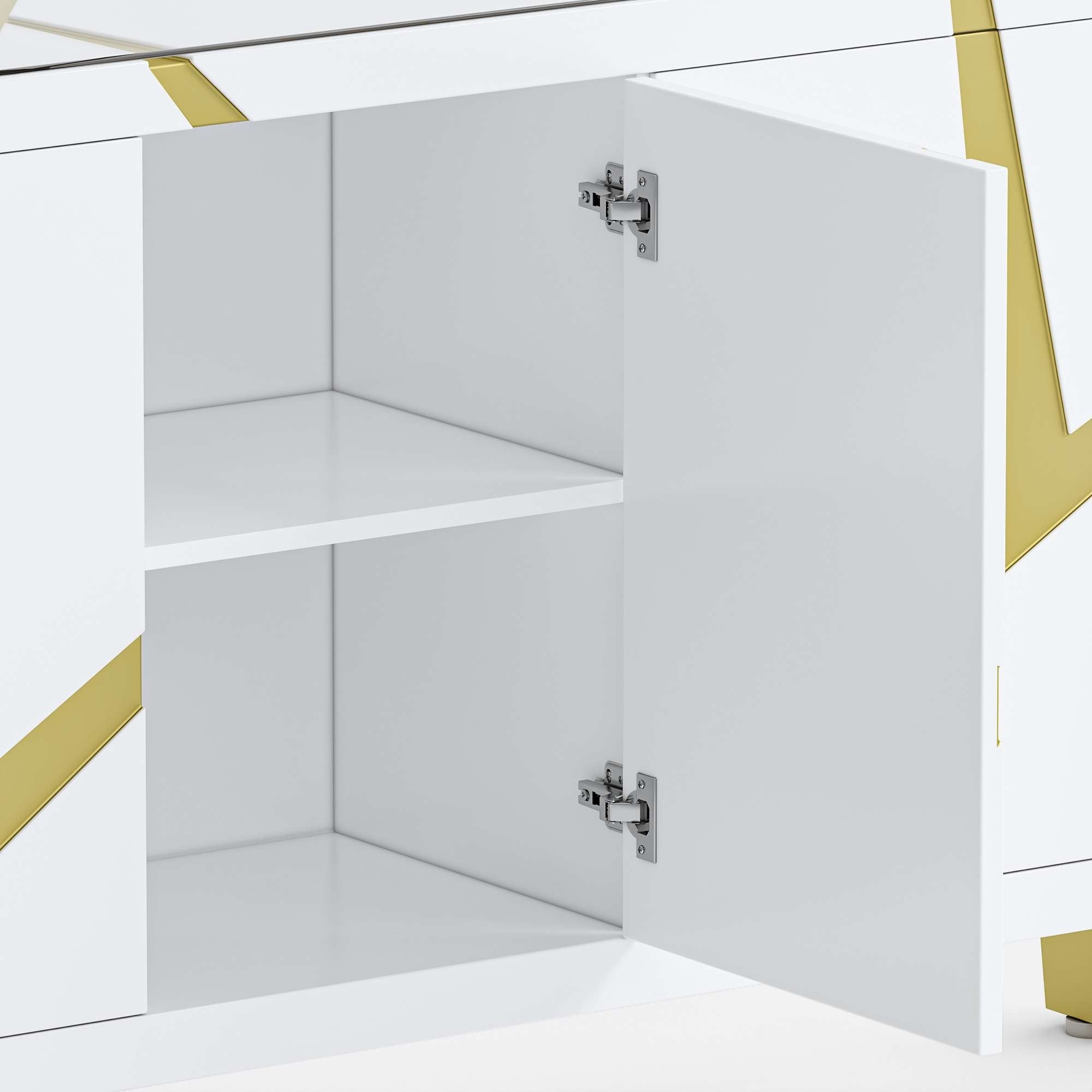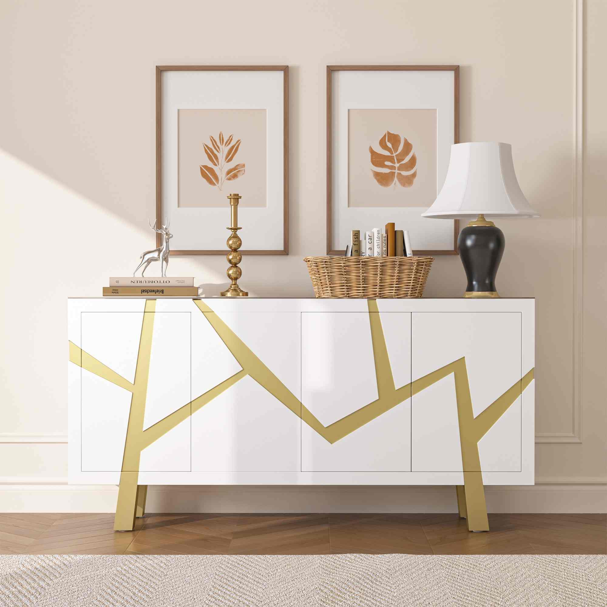 This sideboard features a high-gloss white cabinet body accented with flowing golden ribbon lines, instantly brightening your space. With its four-door, hidden storage design, this piece serves as a dual focal point for both storage and aesthetics, whether placed in a living room or dining area.