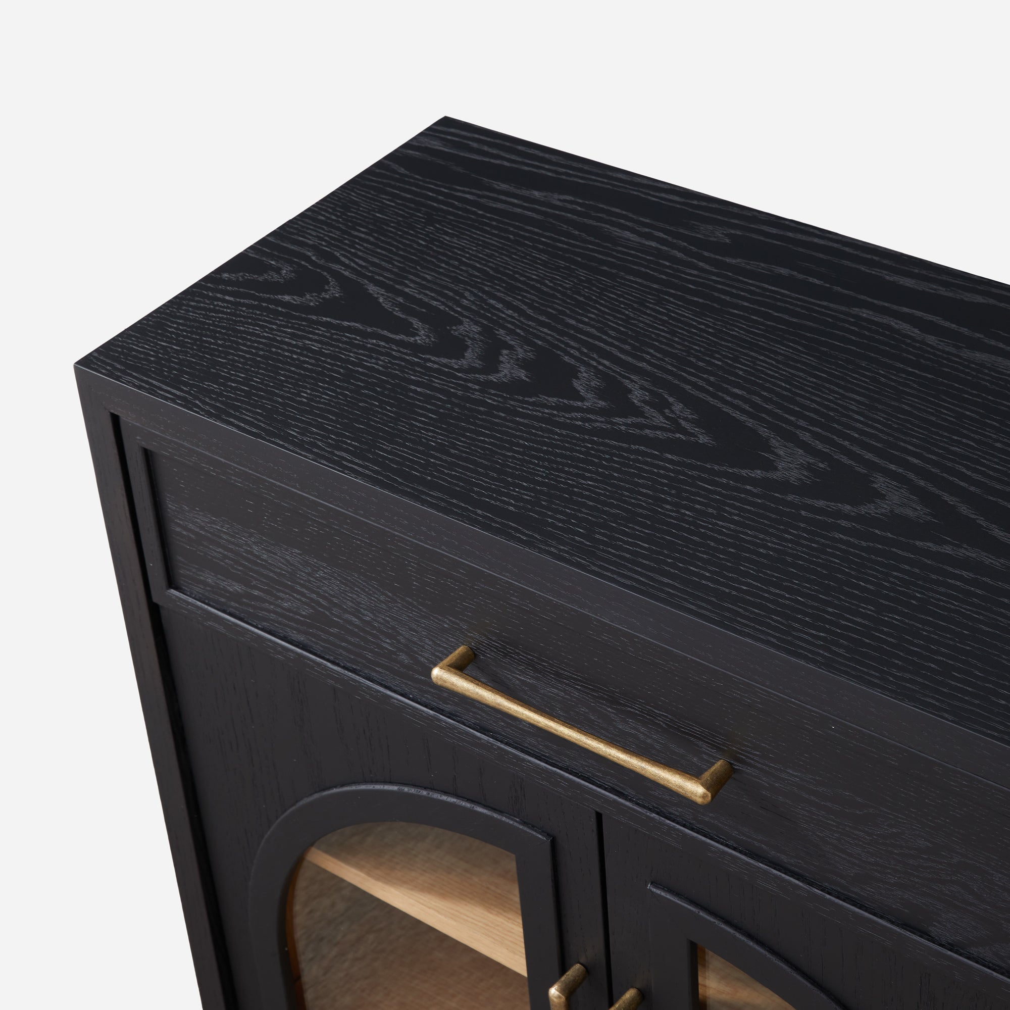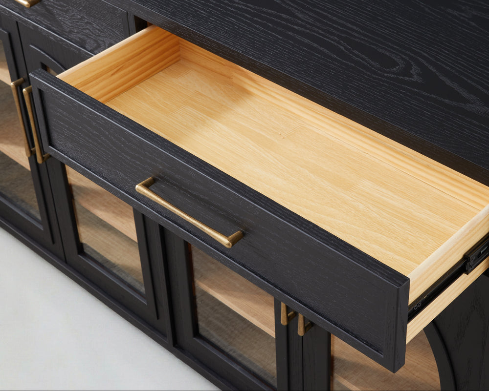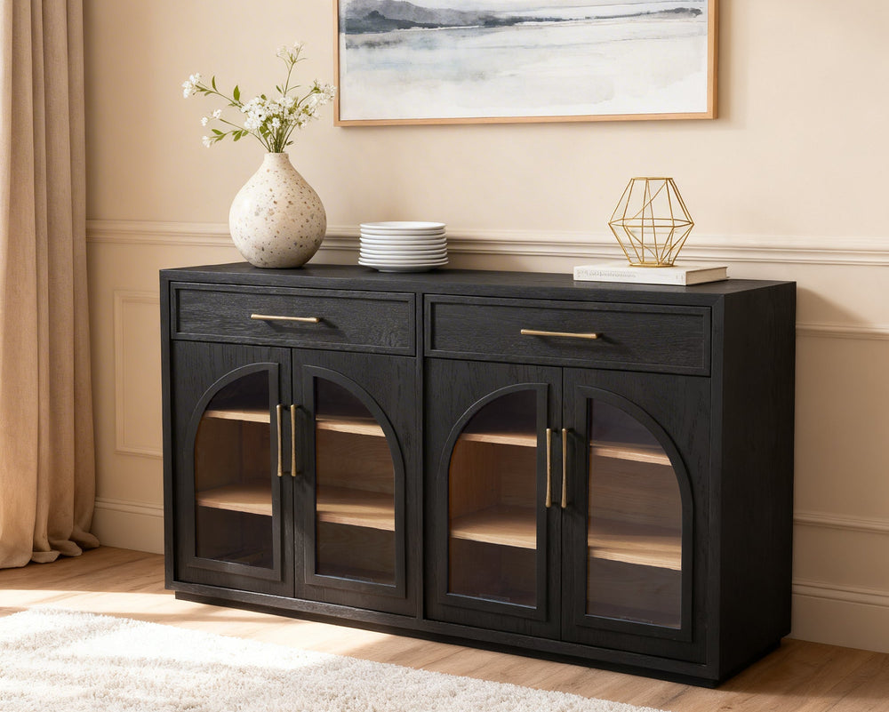 The Artemis Collection merges Mid-century Modern aesthetics with architectural elegance. Featuring four arched glass doors, this two-tone sideboard is accented with elegant metal hardware, creating a bold, sophisticated focal point for your space.