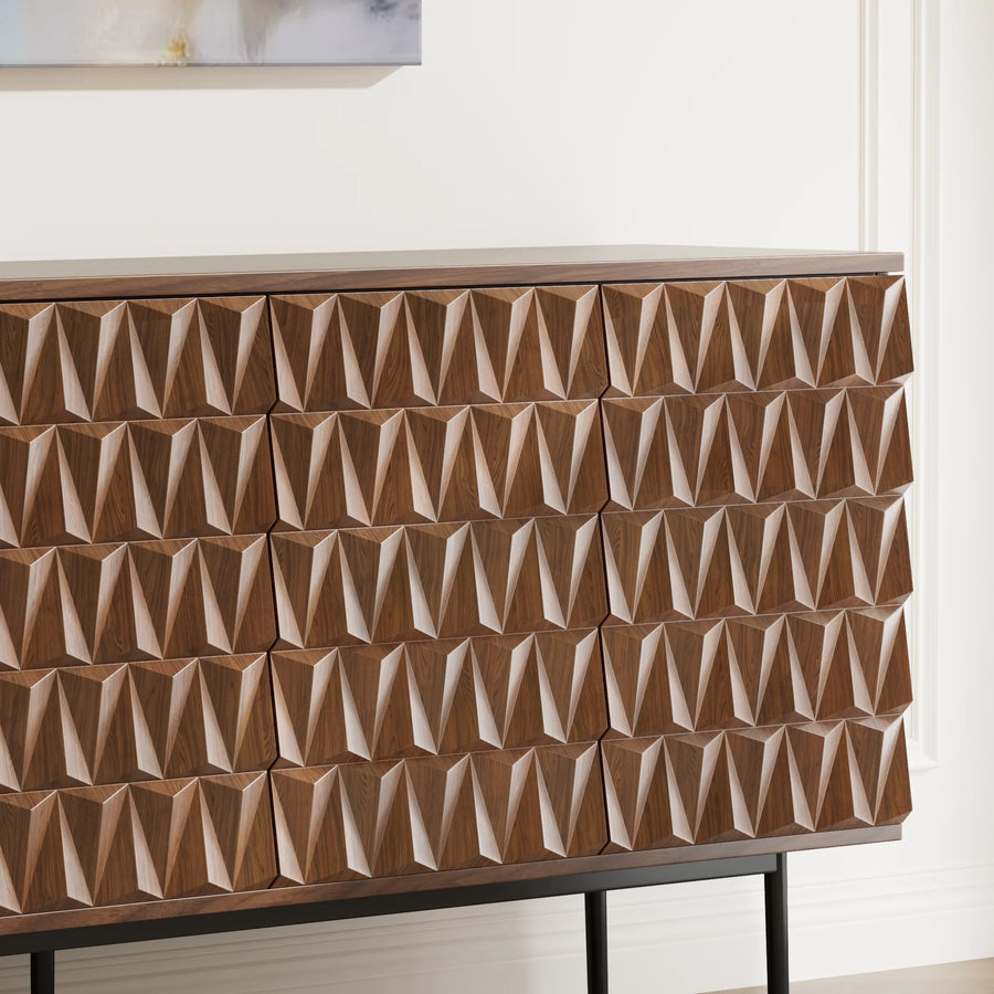 Carved wood, rich veneer, bold metal — storage redefined as design.