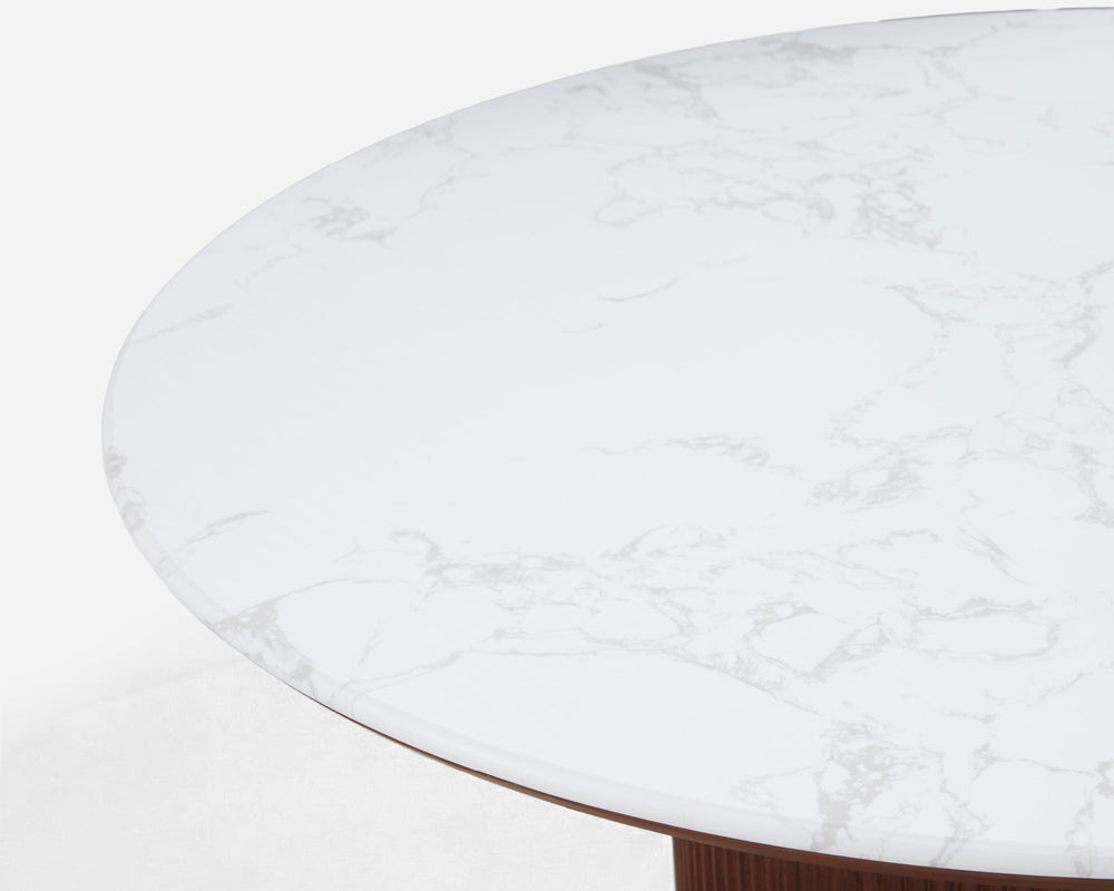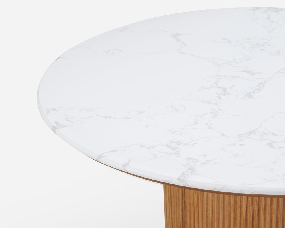 The Esmond Dining Table features a sleek engineered marble top paired with a striking fluted pedestal base. Its architectural silhouette provides a durable yet sophisticated centerpiece, inviting you and your family to enjoy everyday meals in a refined setting.