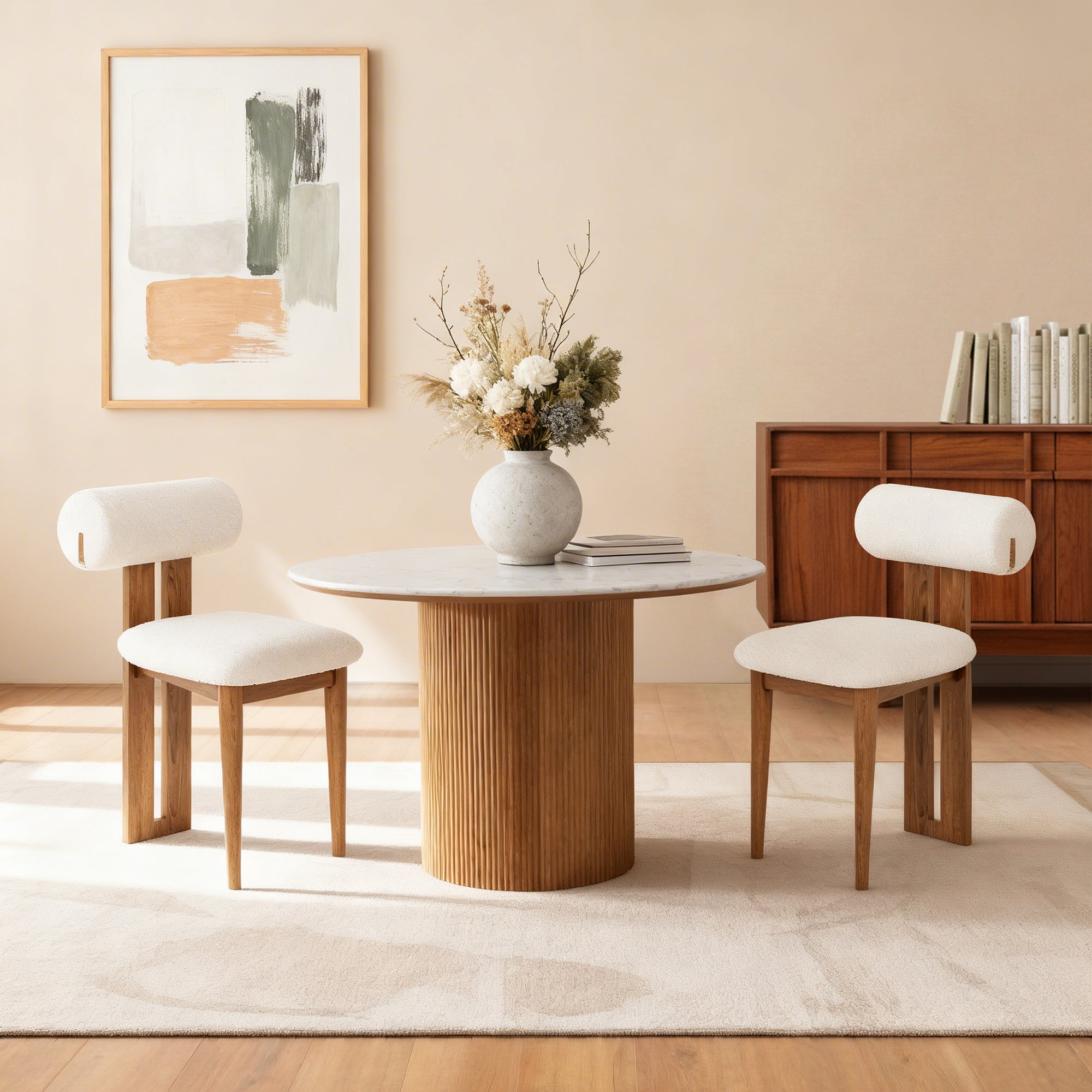 - The fusion of white engineered marble and natural oak textures elevates your space, effortlessly complementing various chair styles.