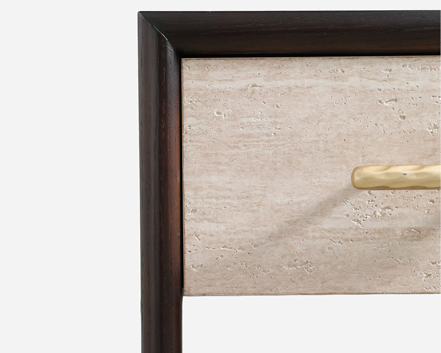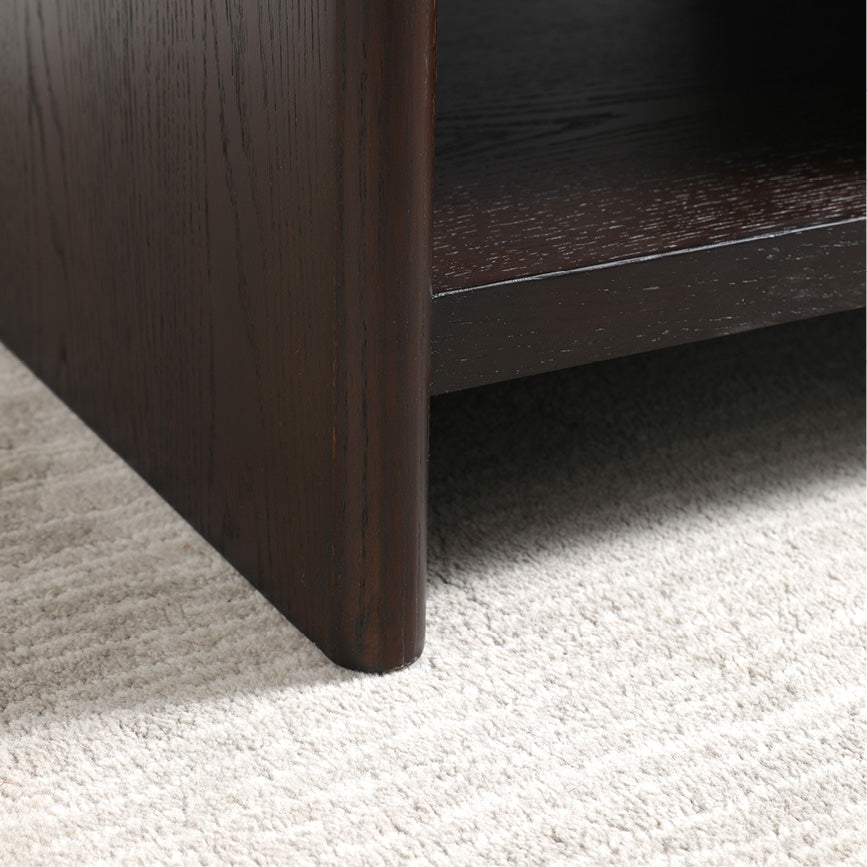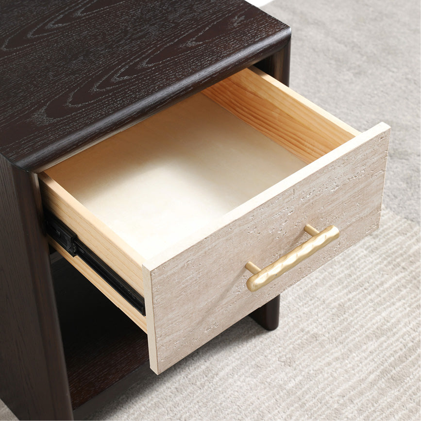 The pine drawer is seamlessly integrated into the walnut body, gliding silently to reveal a striking contrast while keeping clutter out of sight. This hidden unit provides a dedicated home for your essentials, ensuring a pristine and serene living environment.