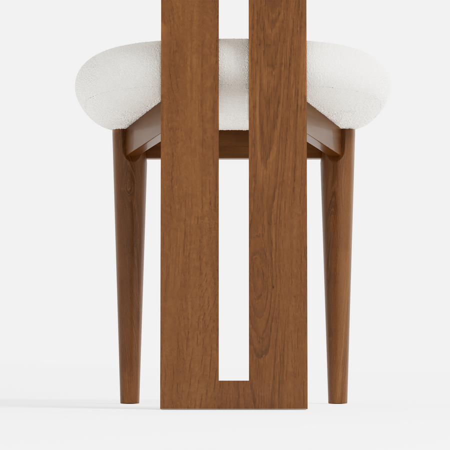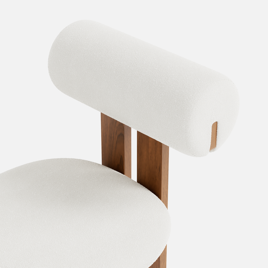Defined by a curved backrest and plush boucle seat for a soft, supportive sit.