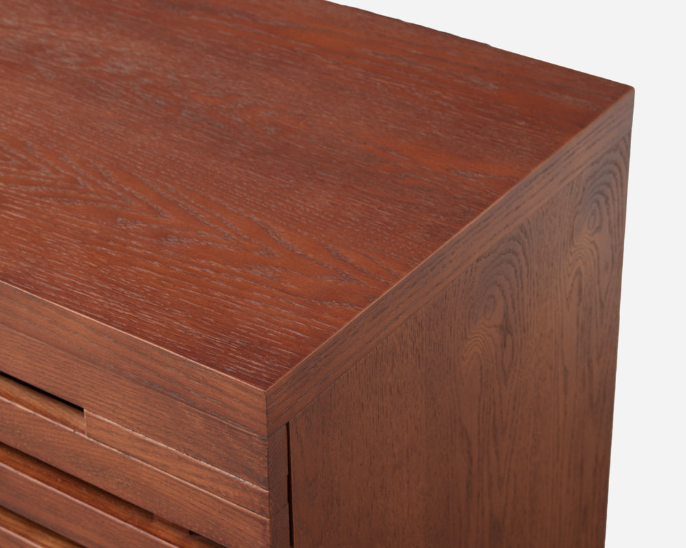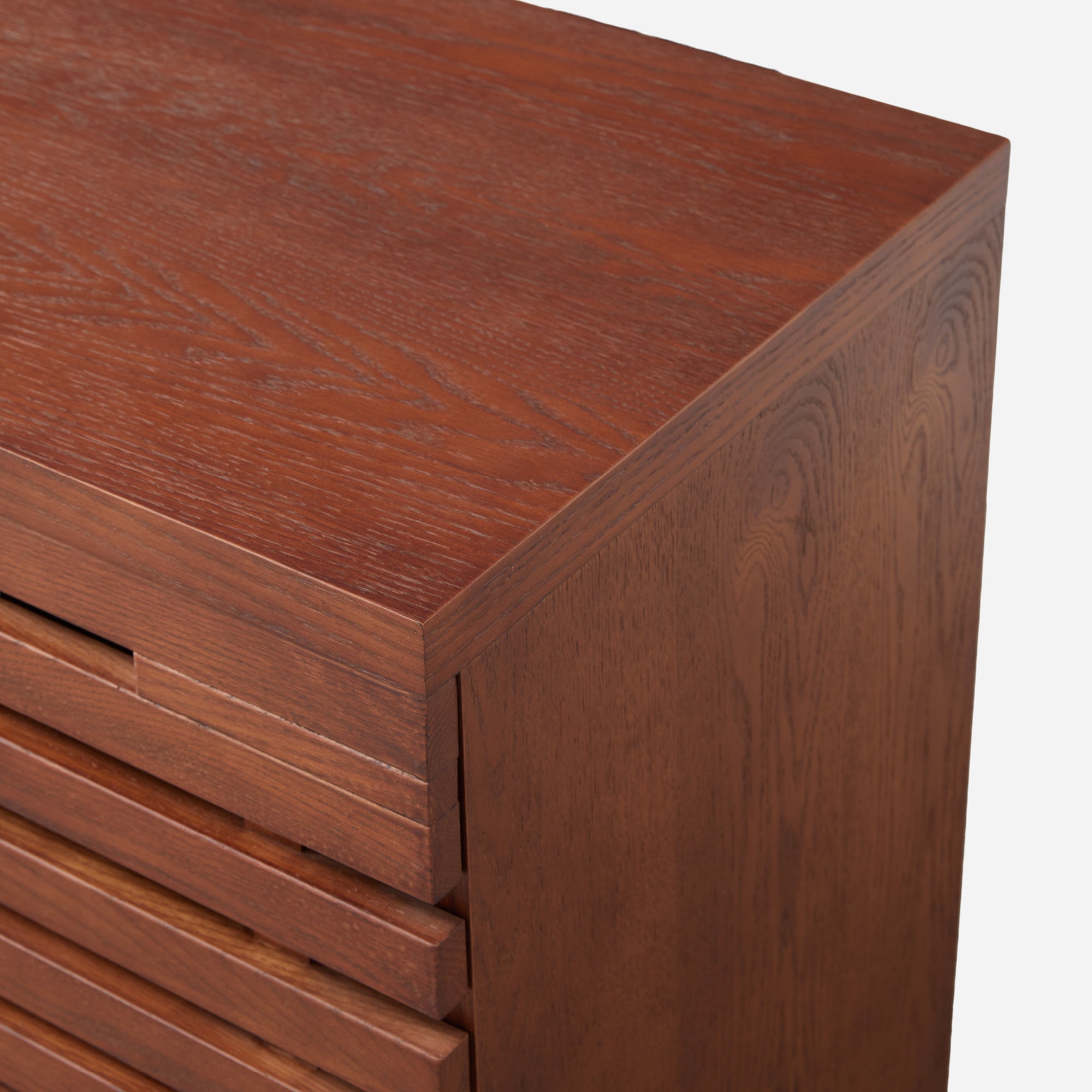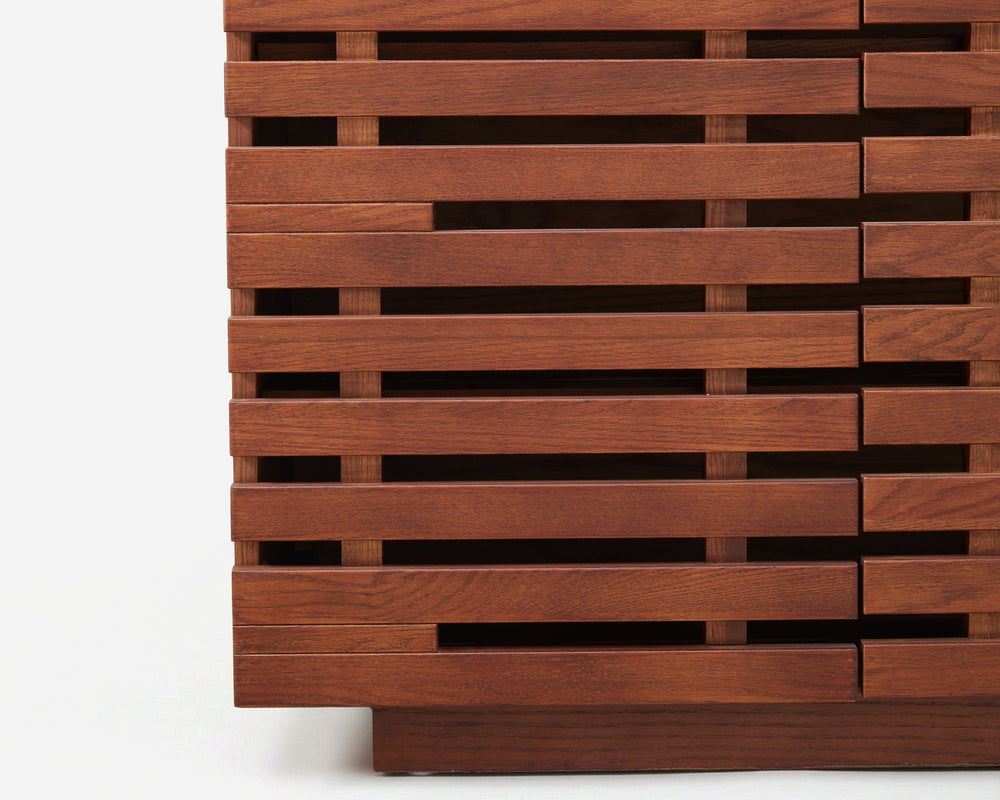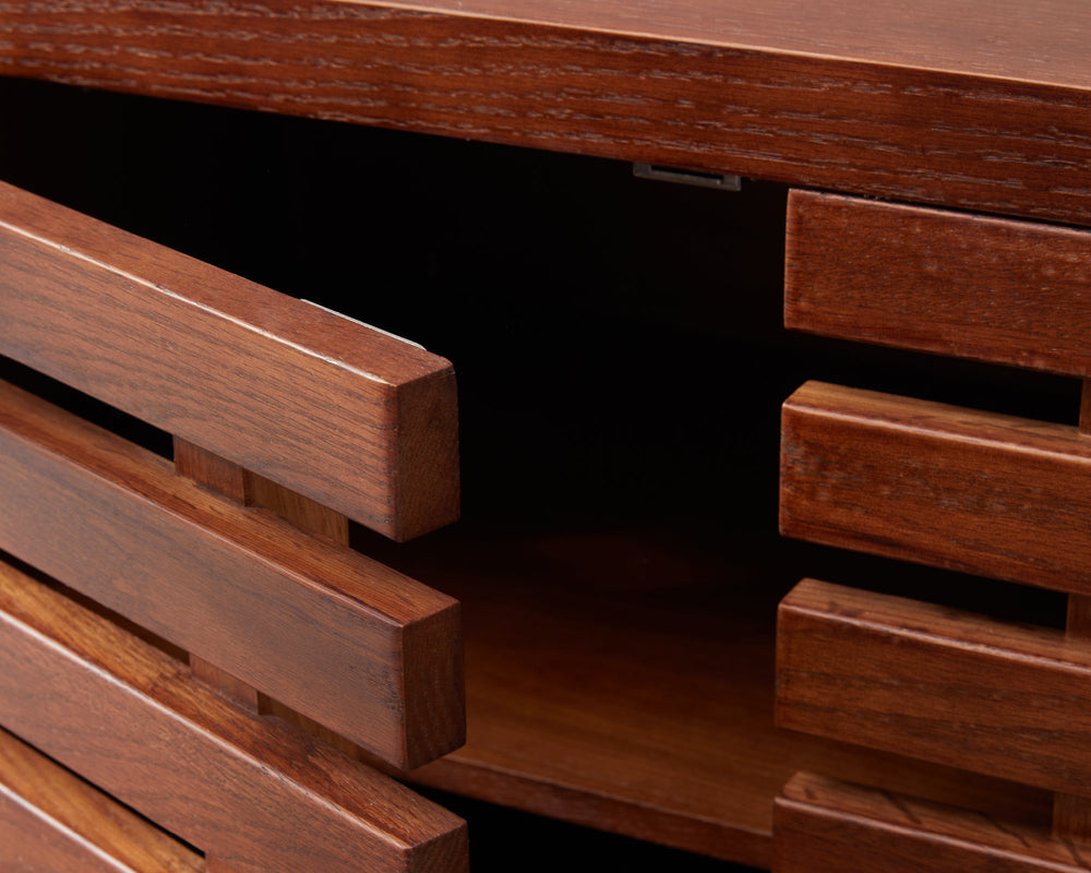 Serving as a refined buffet or credenza, the expansive top offers a stage for curated art. The interior organizes essentials effortlessly, while ventilated slatted doors keep belongings protected and elegantly tucked away.