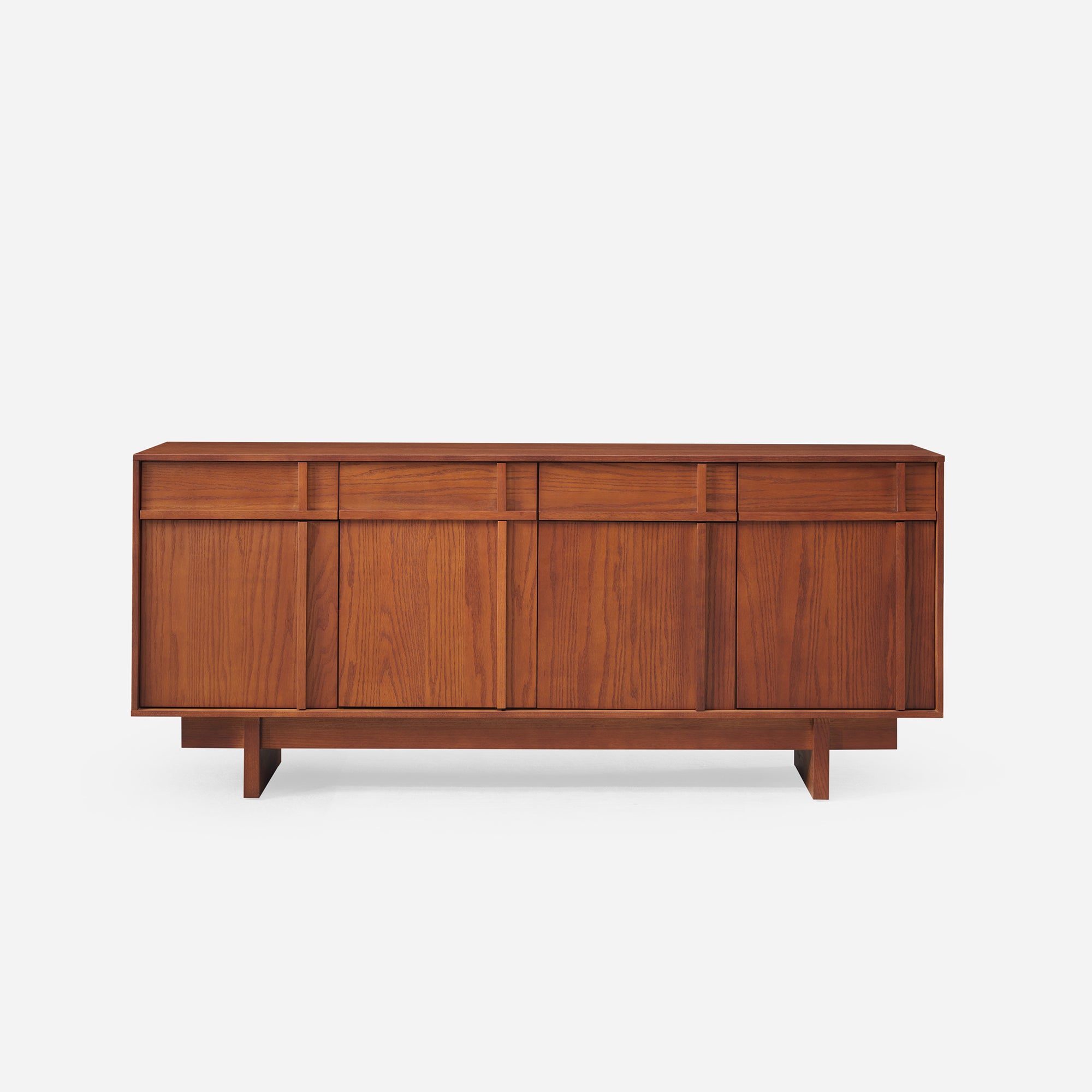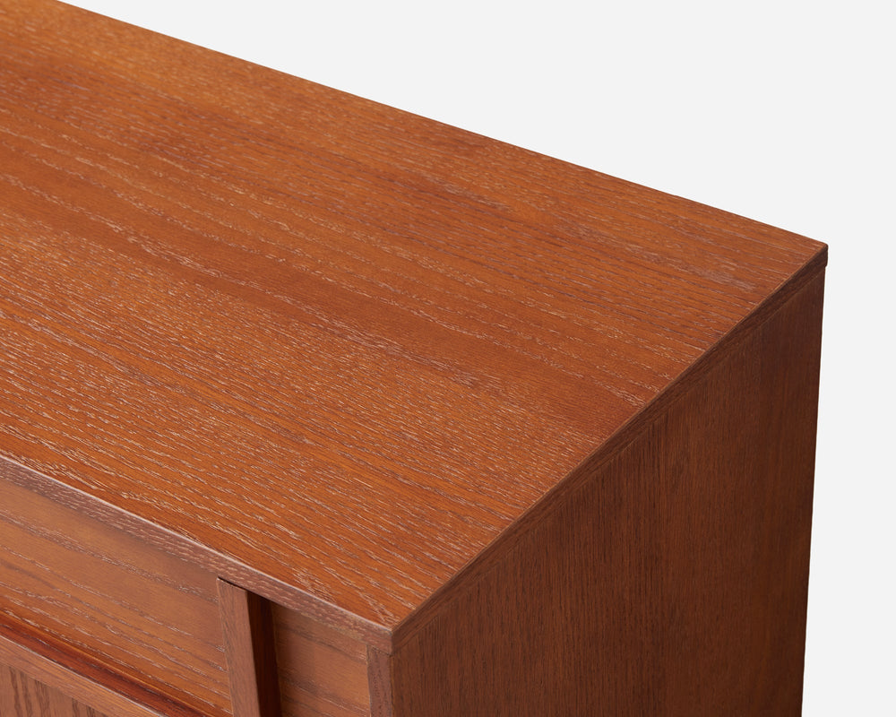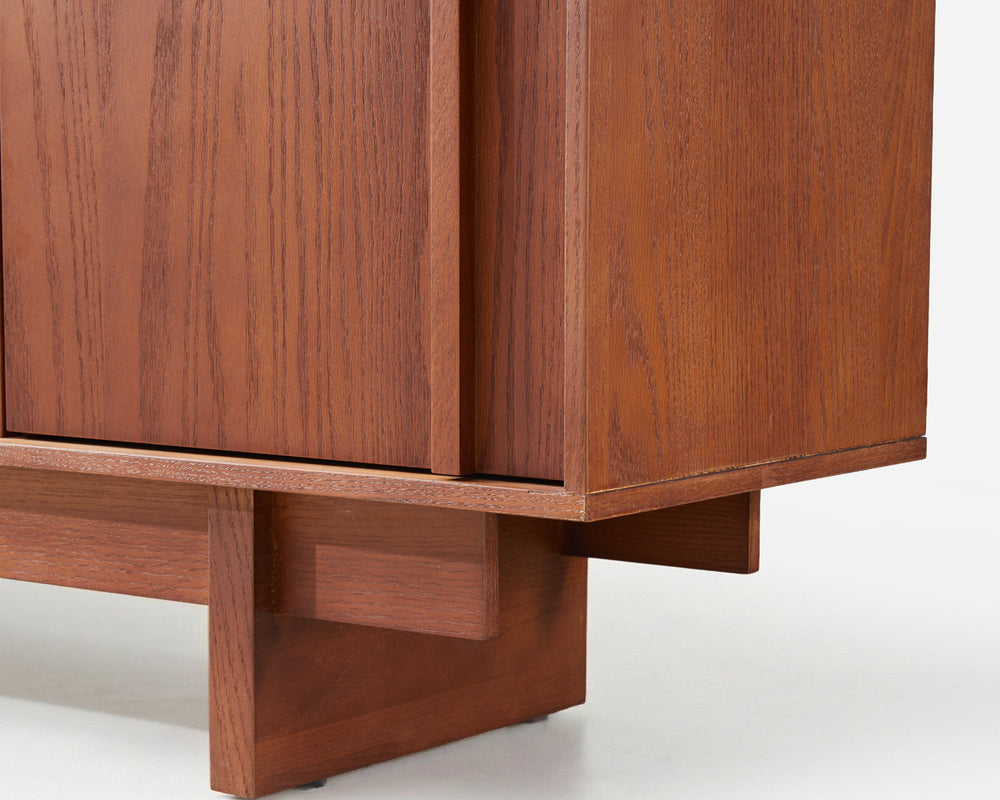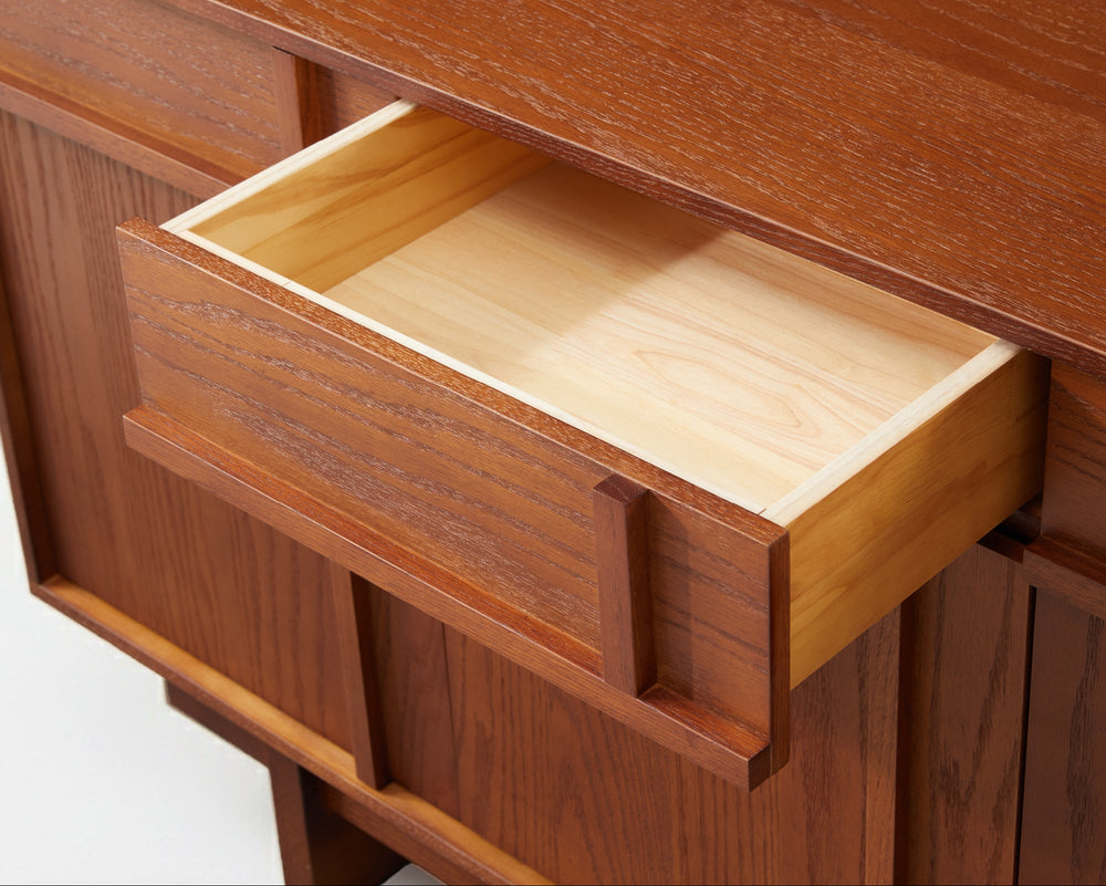 The Walden Sideboard features a striking cross-grain facade and a seamless push-to-open design. Its bold geometric silhouette and deep oak textures create a sophisticated architectural presence that elevates the character of your space.