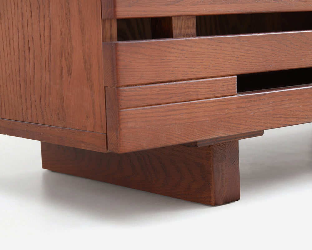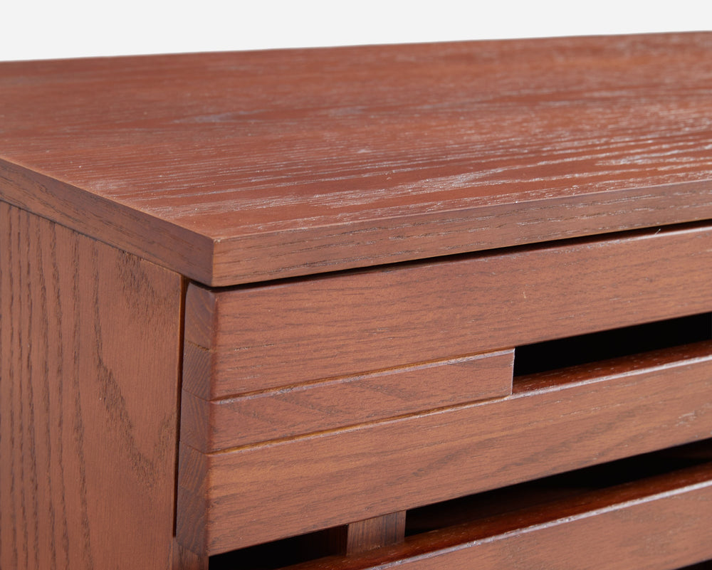 - Open-work slatted design provides natural ventilation for stored items while adding sophisticated tactile depth and visual intrigue.