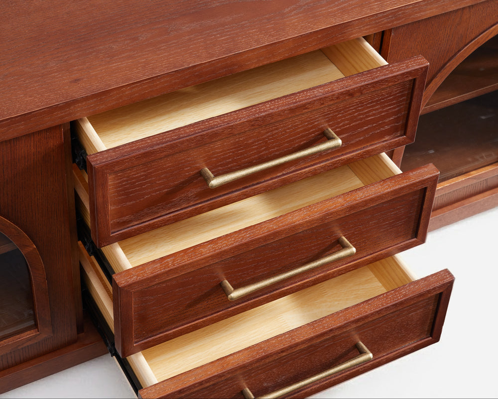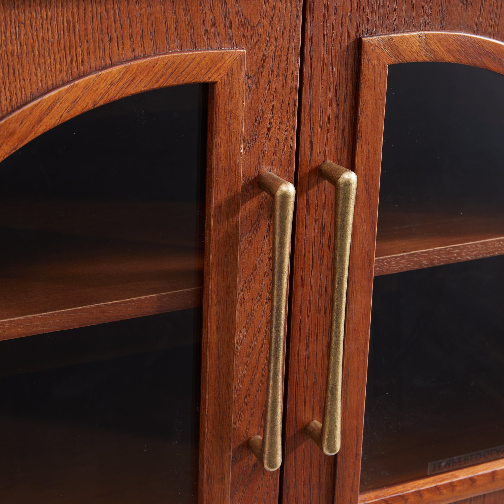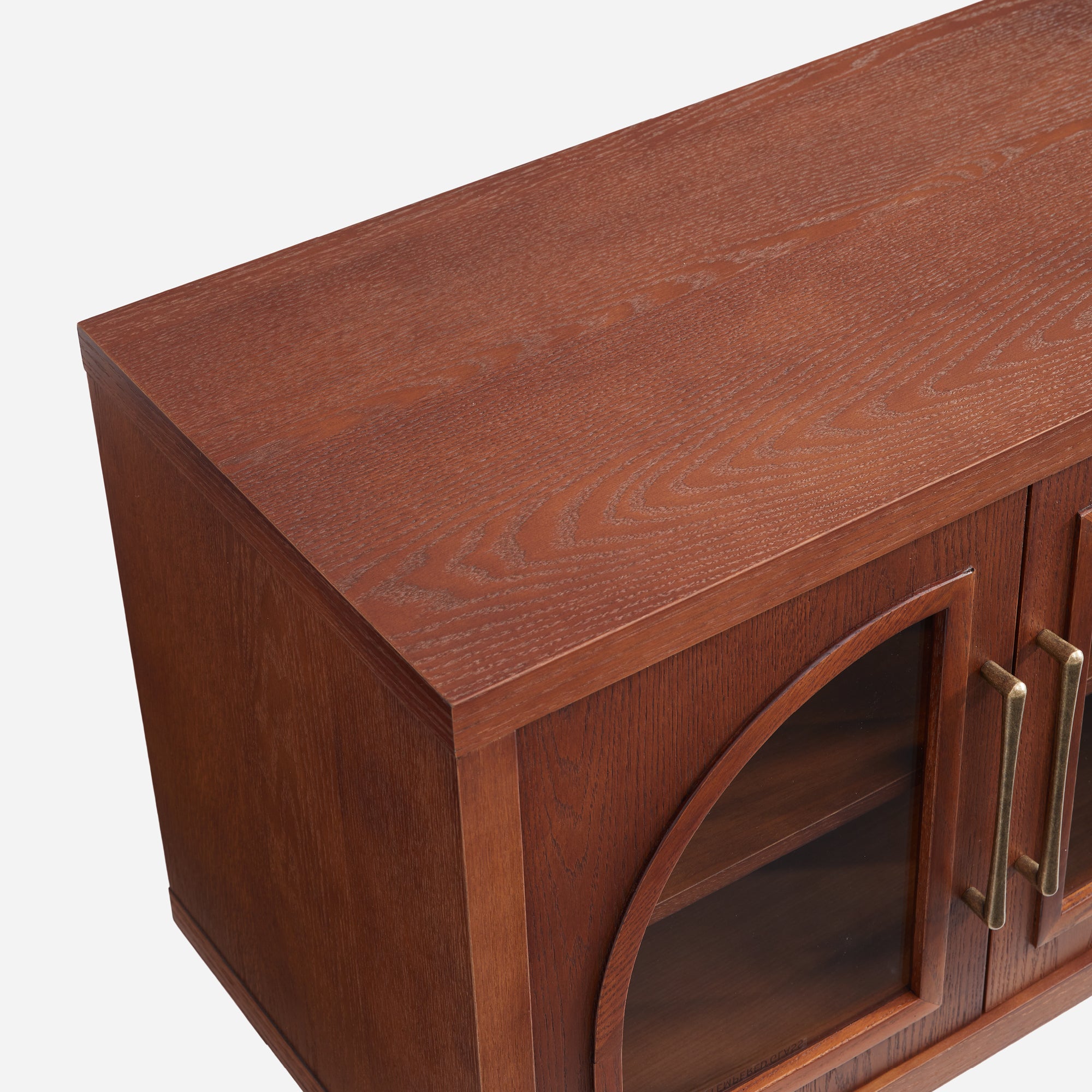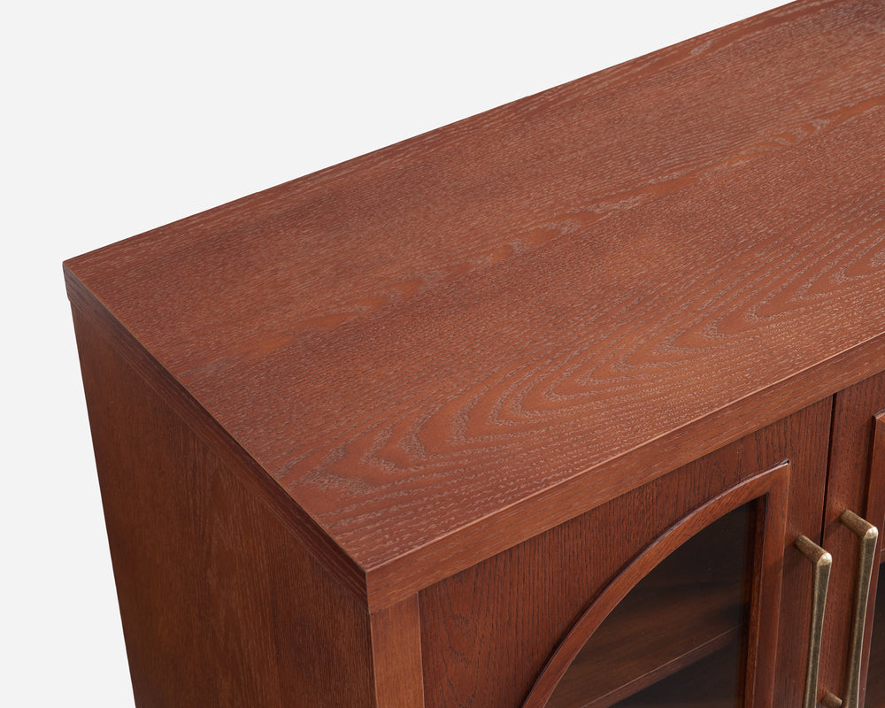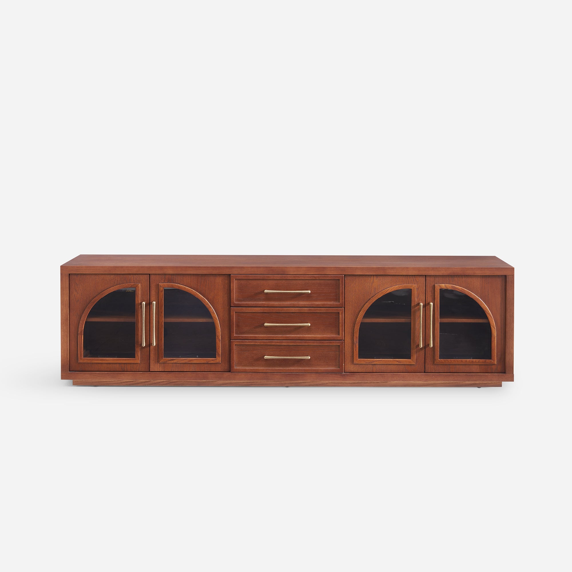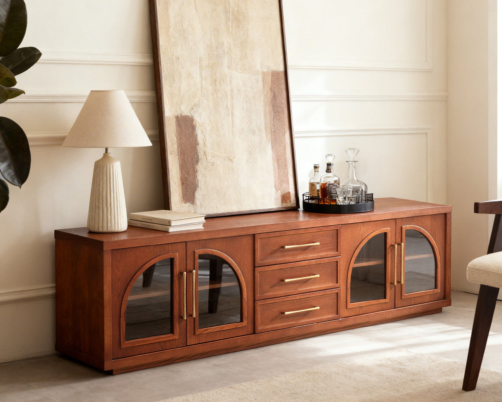 The Artemis Collection merges Mid-century Modern aesthetics with architectural elegance. Featuring four arched glass doors and a rich walnut-toned finish, this media console brings a sophisticated, light-filled presence to your home.