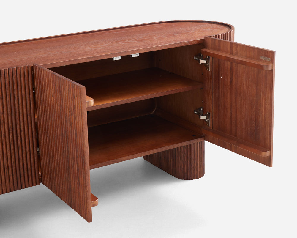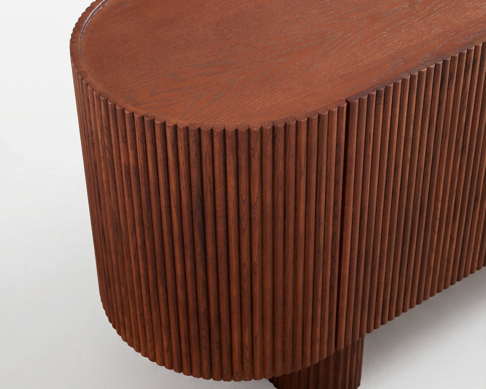 The Esmond Collection is defined by its rhythmic fluted detailing, blending architectural precision with organic warmth. This sculptural oval silhouette with natural wood grains serves as a soulful and grounding centerpiece for your media space.