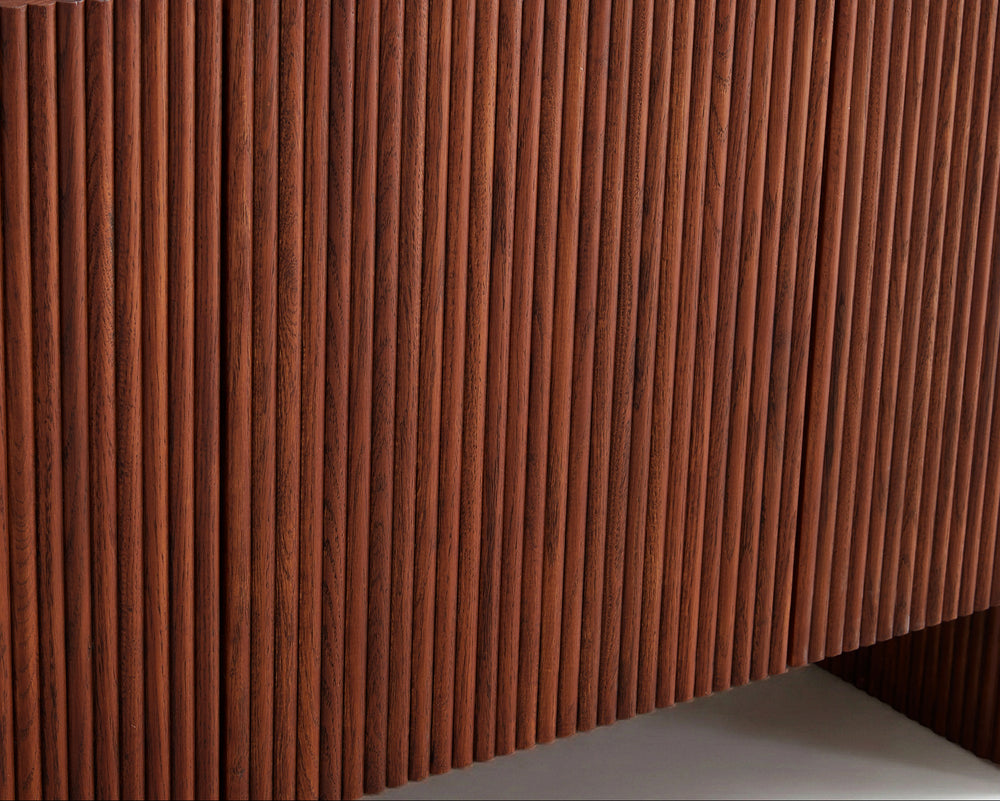 - Cohesive fluted pillars extend the rhythmic texture from the cabinet to the floor, creating a bold, architectural statement piece.