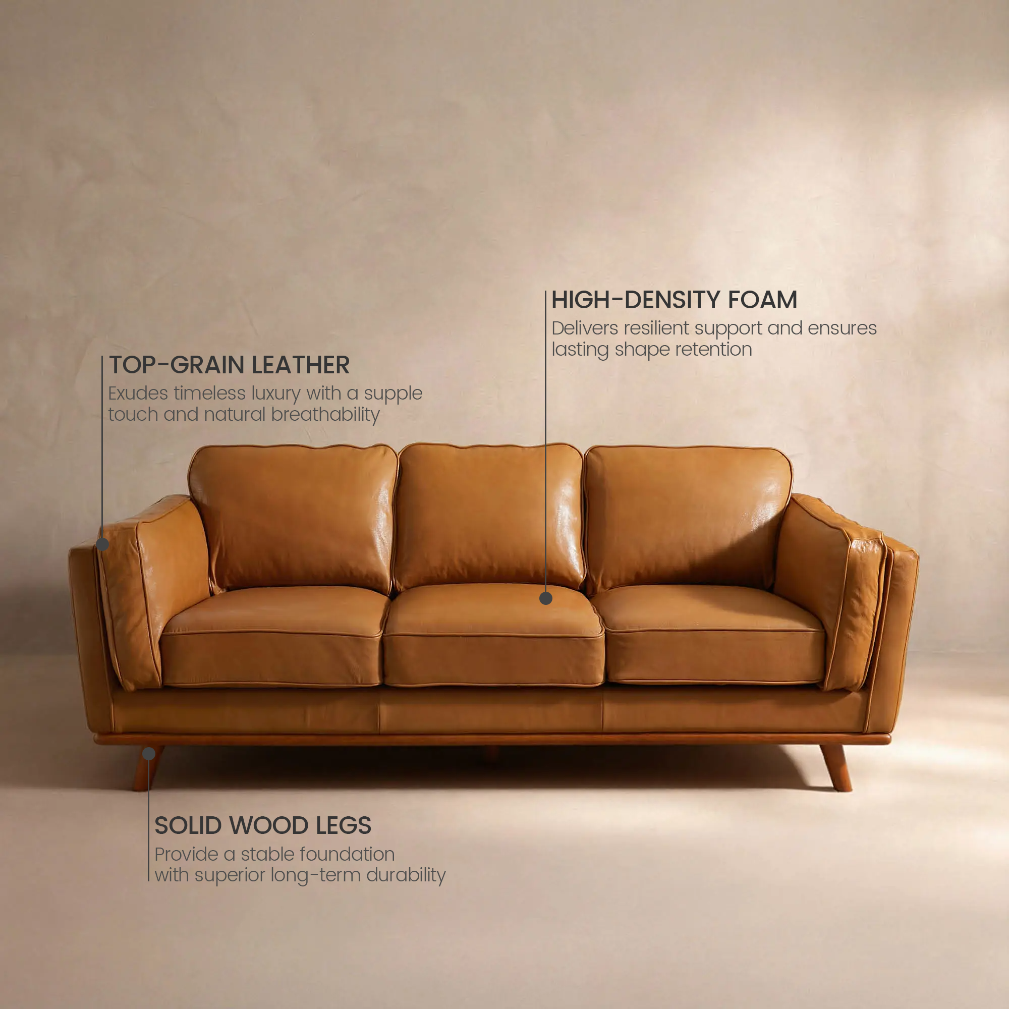 Settle into the cradle of top-grain leather and high-density foam, where tension dissolves. It offers just-right support, whether for weekend reading or evening gatherings.