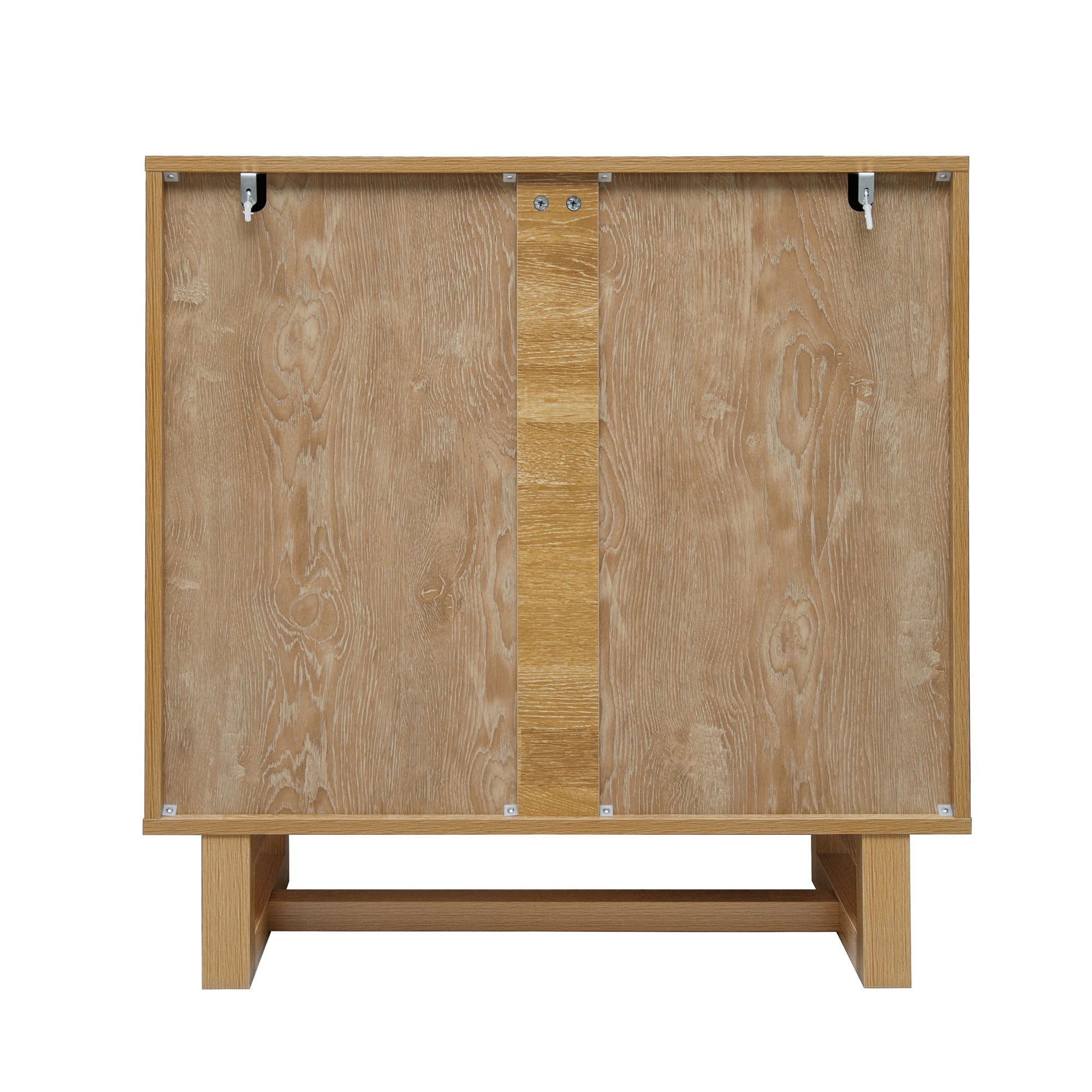 A versatile 2-door cabinet designed with a clean, wood-like finish for a natural look. Features an adjustable shelf for flexible storage, handle-free doors with a sleek fan-shaped design, wall-mounting safety hardware, and floor-protecting pads.