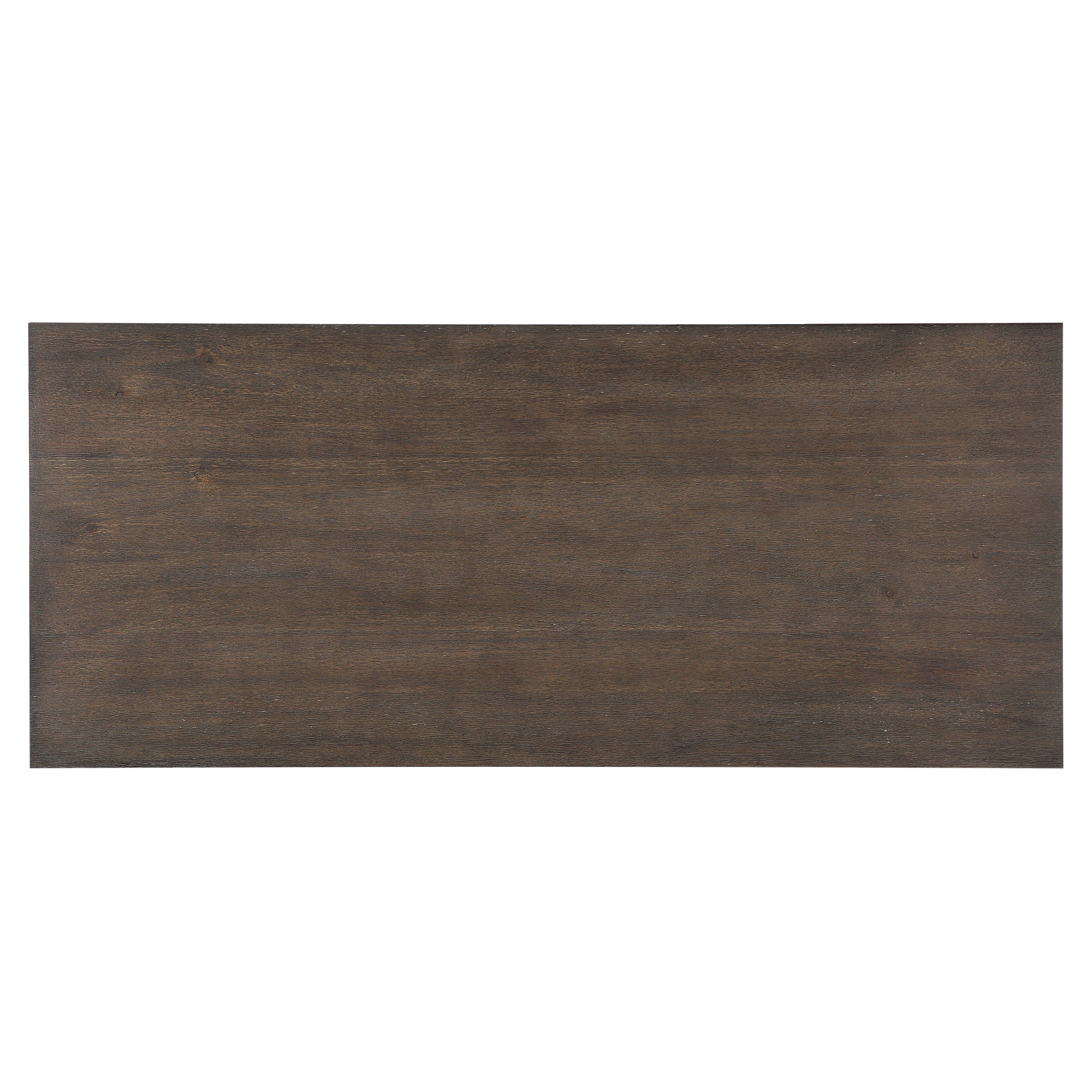 The writing desk blends bold curves with French provincial details, offering ample workspace and storage. Its distressed dark oak finish on acacia veneer adds texture and timeless elegance to any home office.