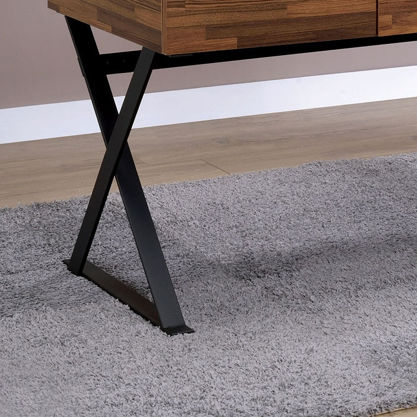 Desks offer the perfect opportunity for industrial design elements to shine. X-cross leg supports finished in a textured sand black supporting a lovely wooden paneled table top. Three slim desk drawers offer plentiful room for your supplies, and an integrated USB and power outlet keep your necessary devices powered up.
