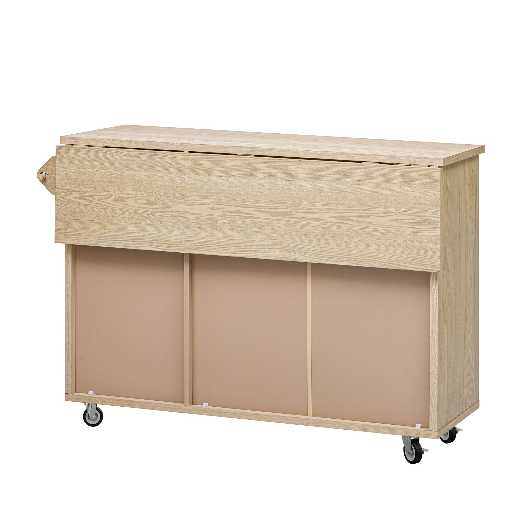The Kitchen Island is crafted with solid ash wood veneer for lasting quality. Handwoven details and a drop-leaf design add coastal charm, while hidden storage and smooth-rolling wheels bring function and flexibility to any space.