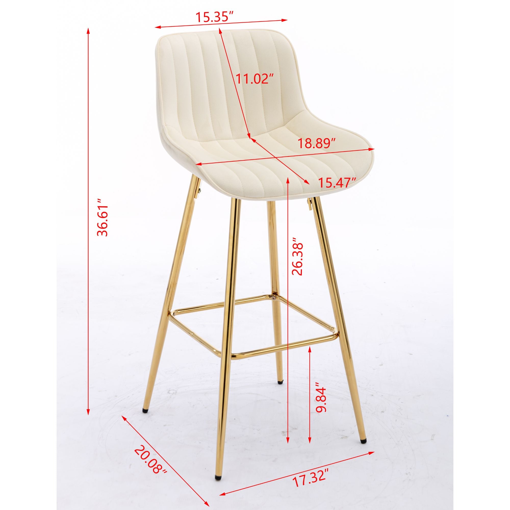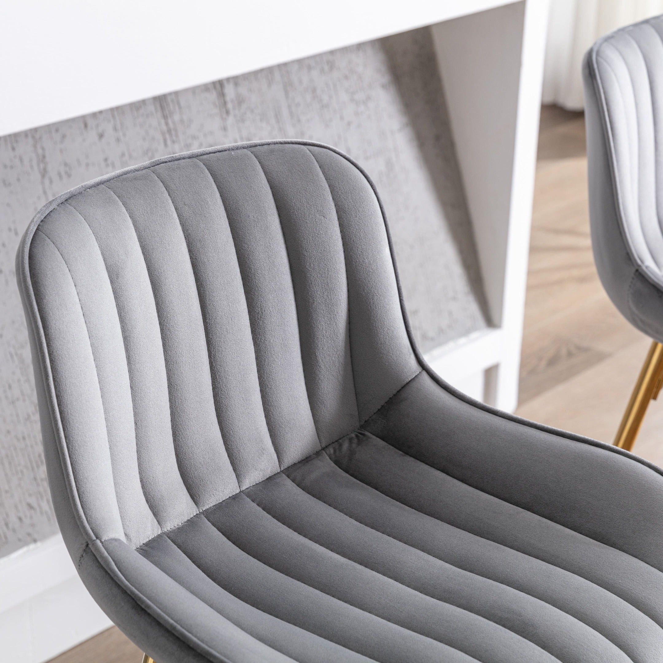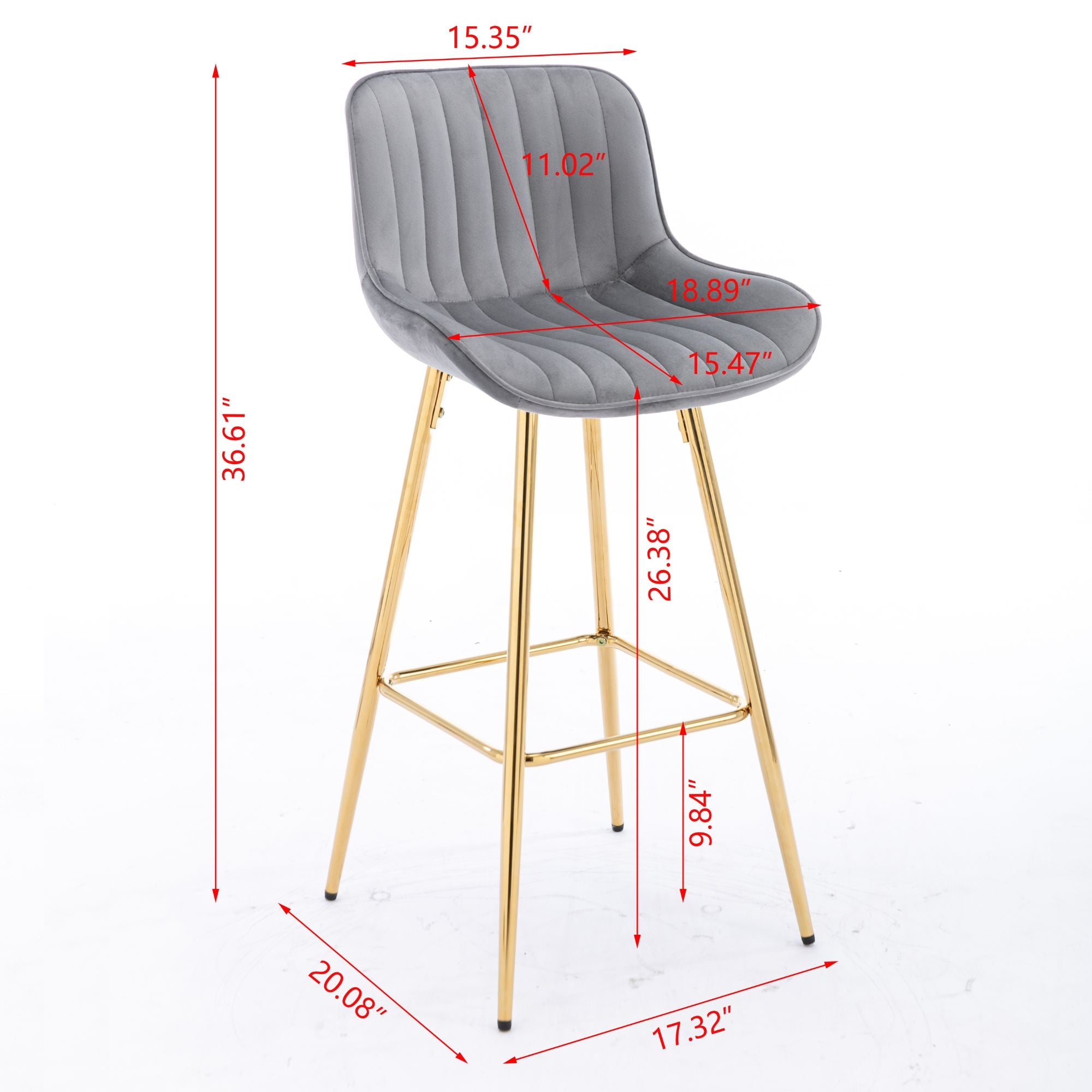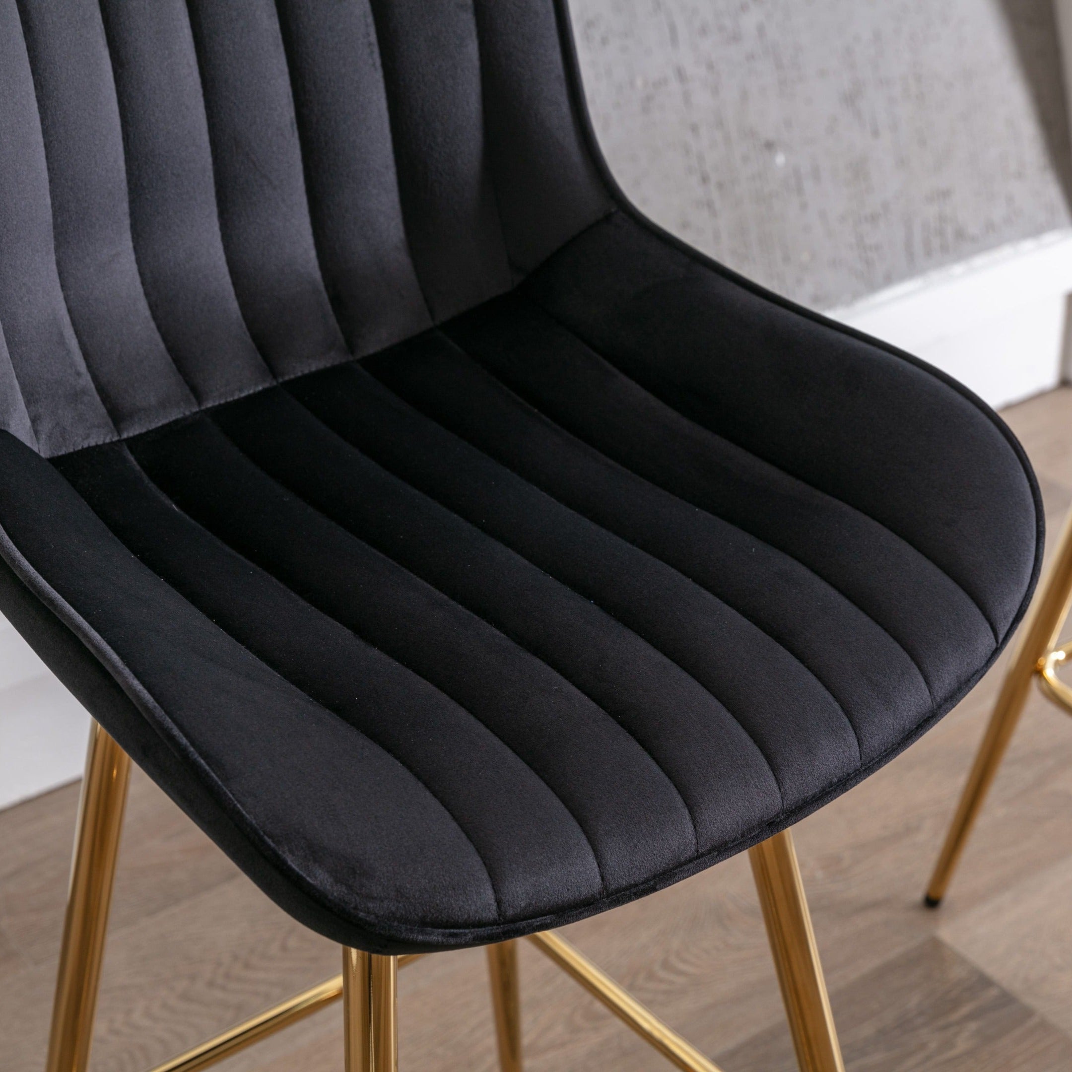 This set of 2 counter-height bar stools features plush velvet seats, golden legs, and a chrome footrest for modern elegance. At 26" high, they’re perfect for kitchen islands or counters, offering both comfort and a refined contemporary look.