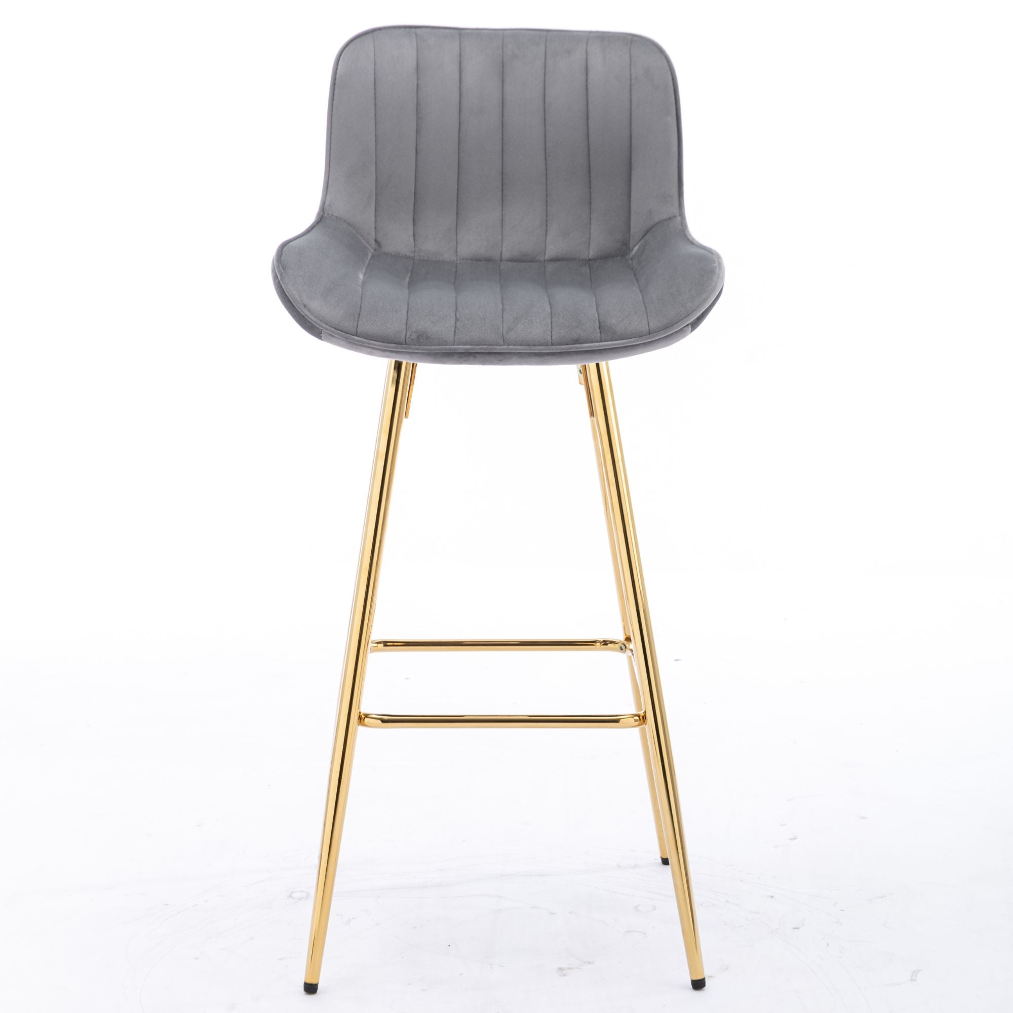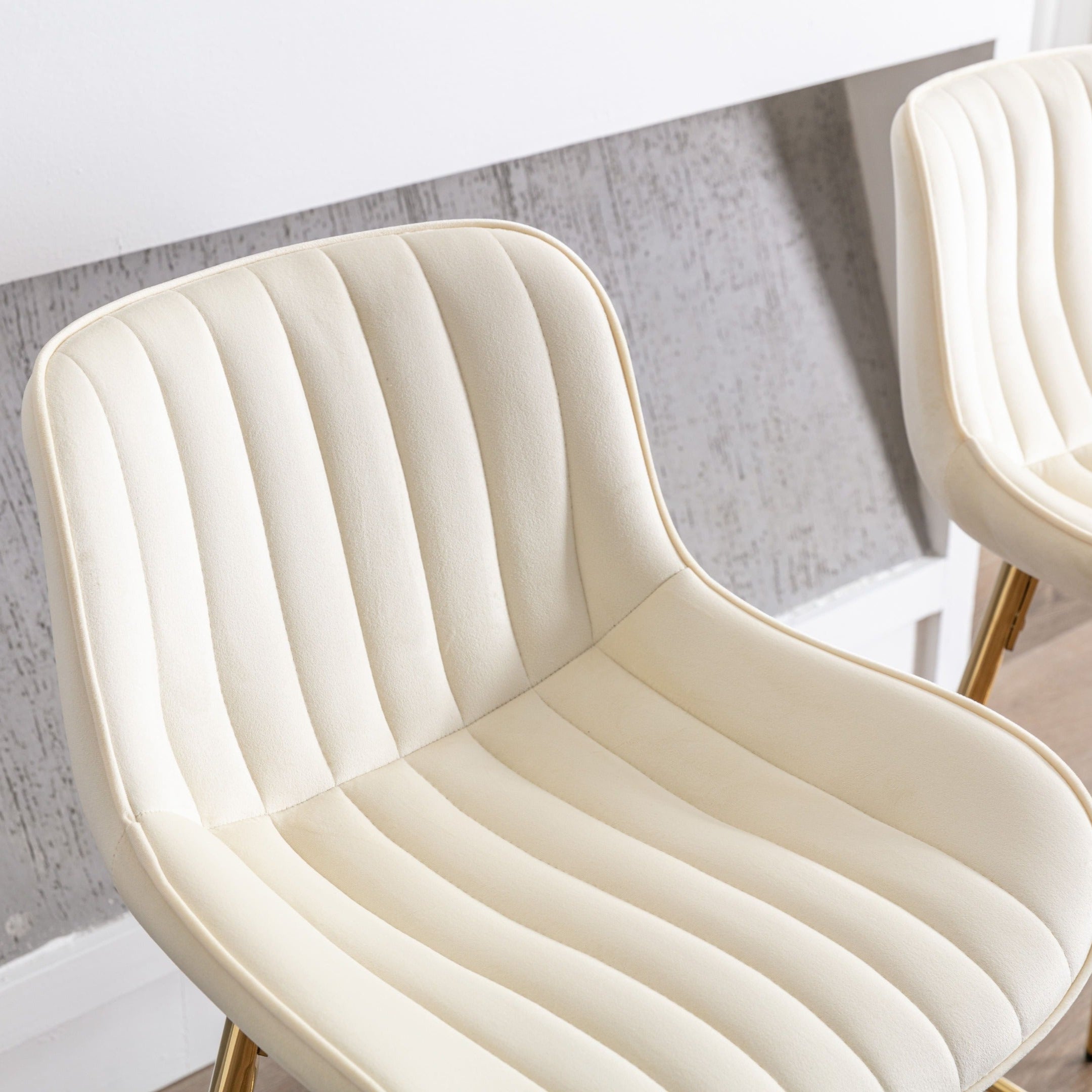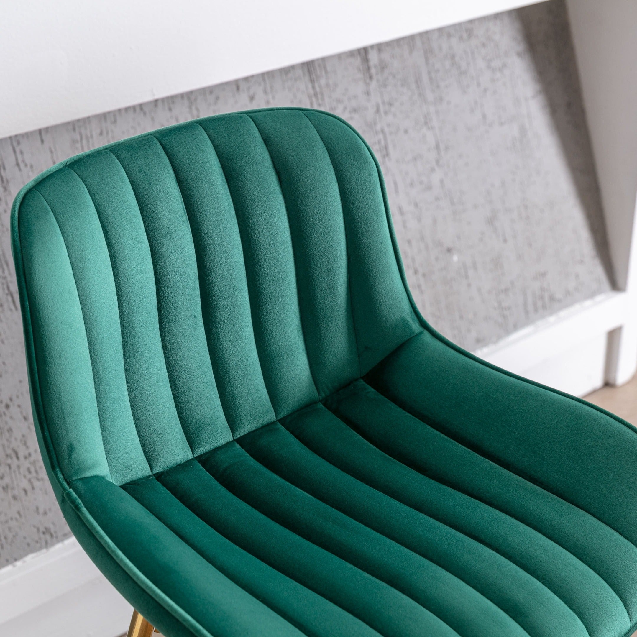 This set of 2 counter-height bar stools features plush velvet seats, golden legs, and a chrome footrest for modern elegance. At 26" high, they’re perfect for kitchen islands or counters, offering both comfort and a refined contemporary look.
