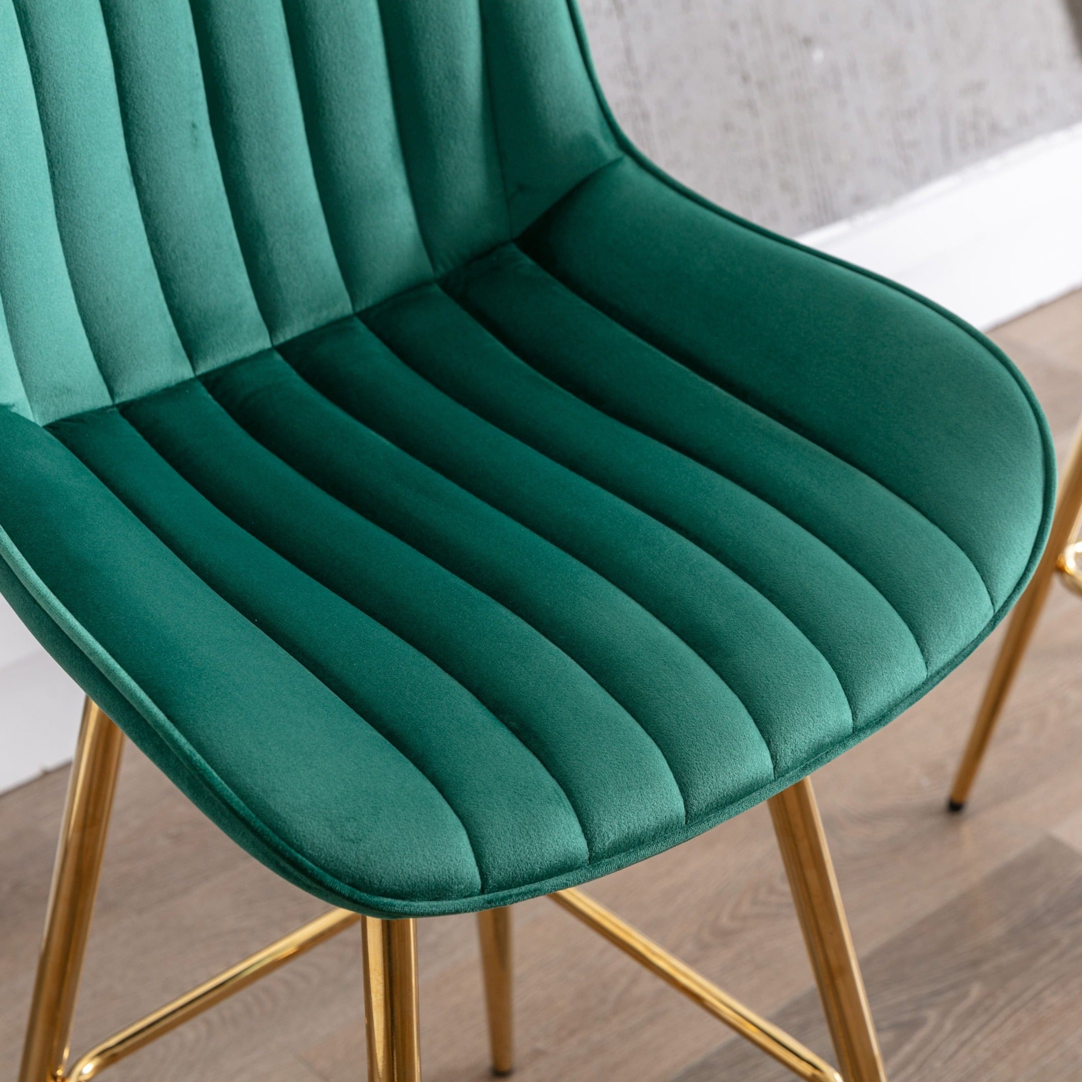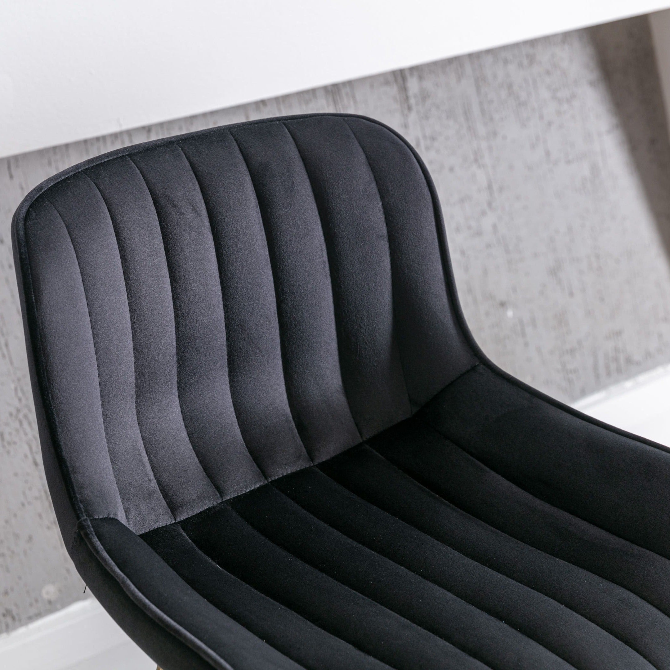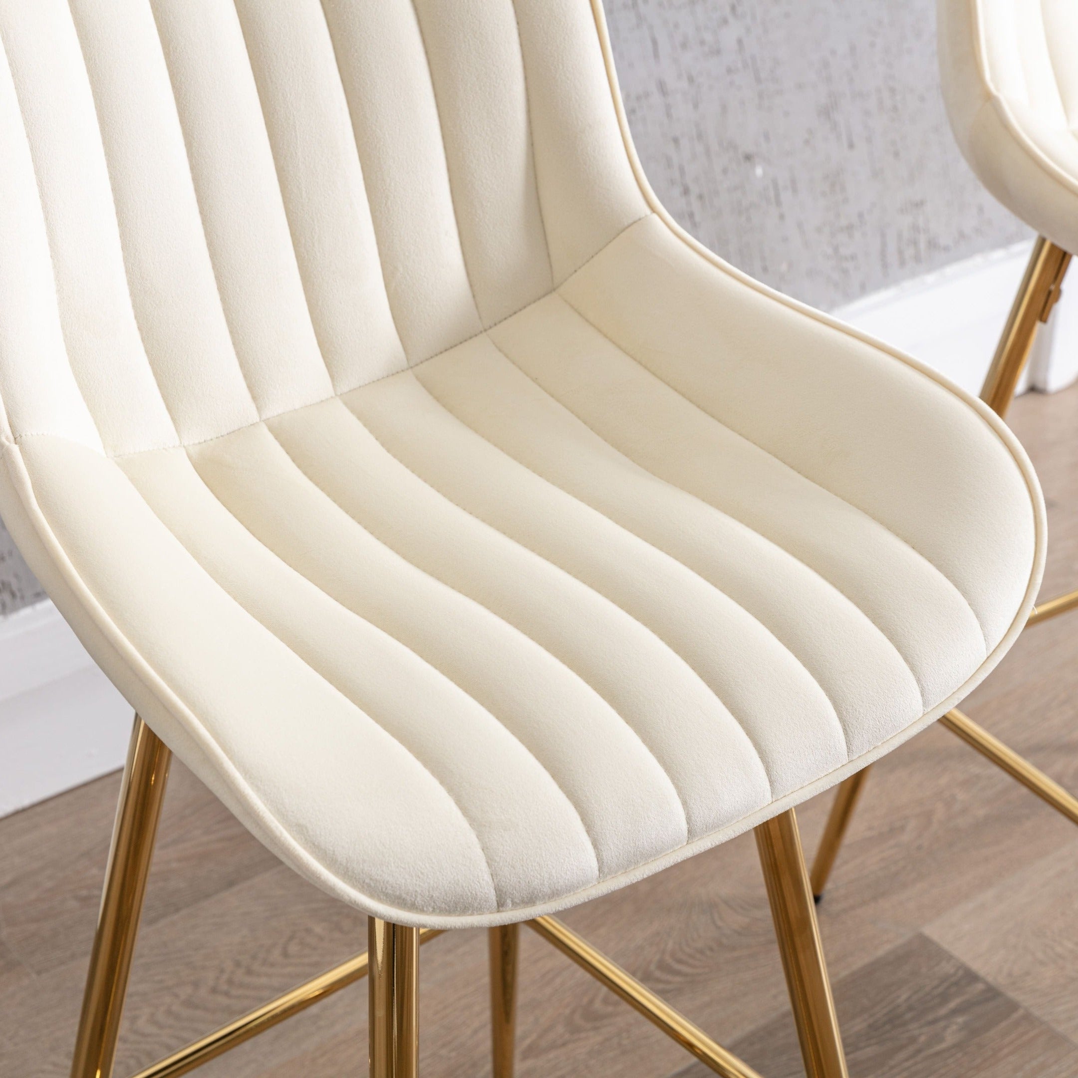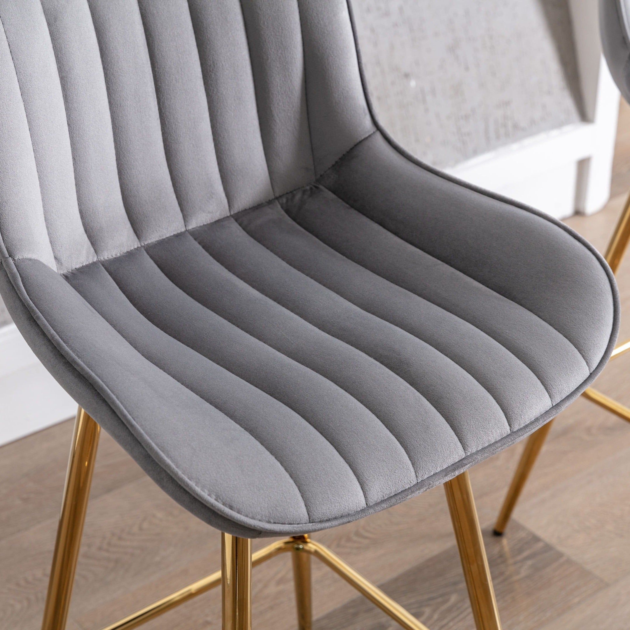 This set of 2 counter-height bar stools features plush velvet seats, golden legs, and a chrome footrest for modern elegance. At 26" high, they’re perfect for kitchen islands or counters, offering both comfort and a refined contemporary look.