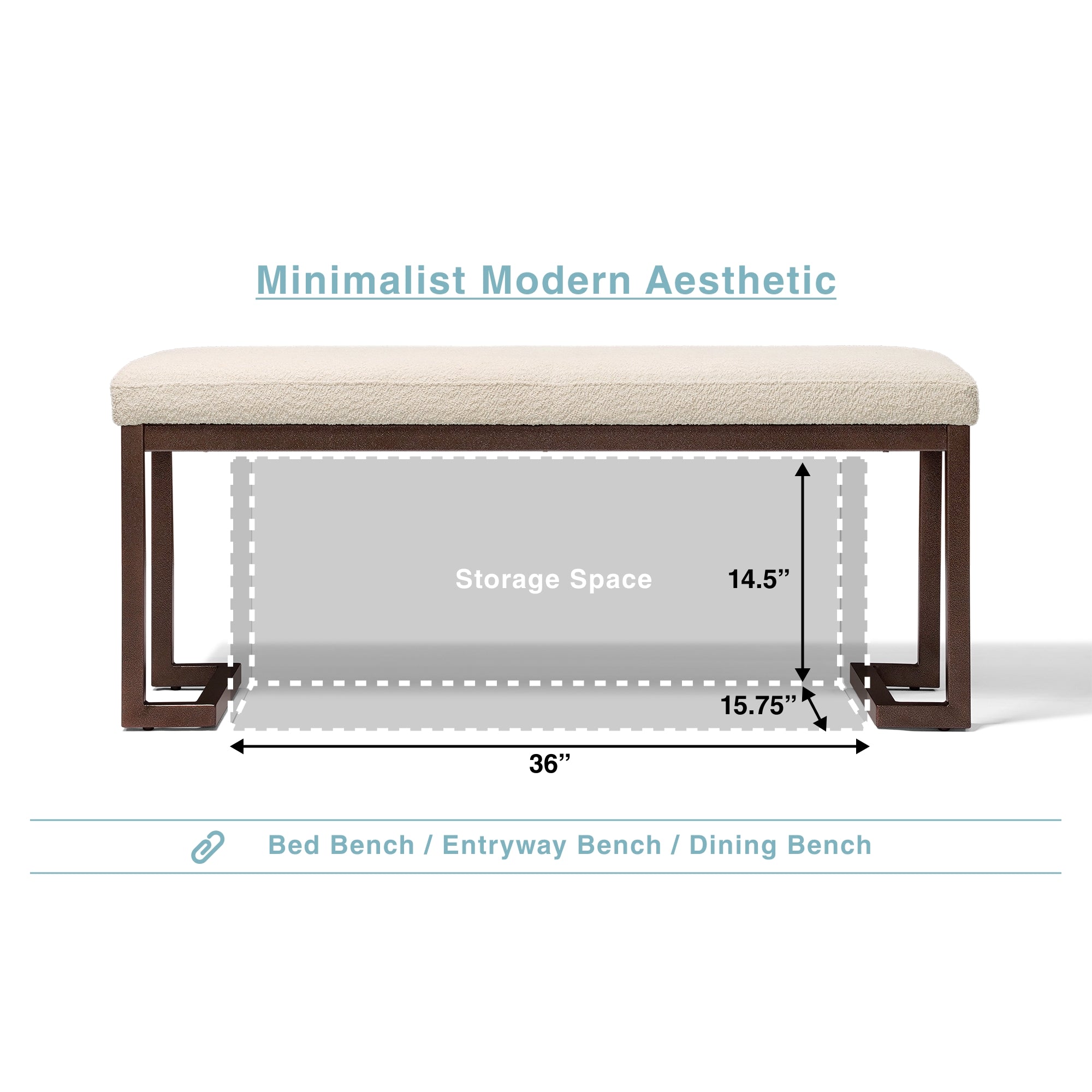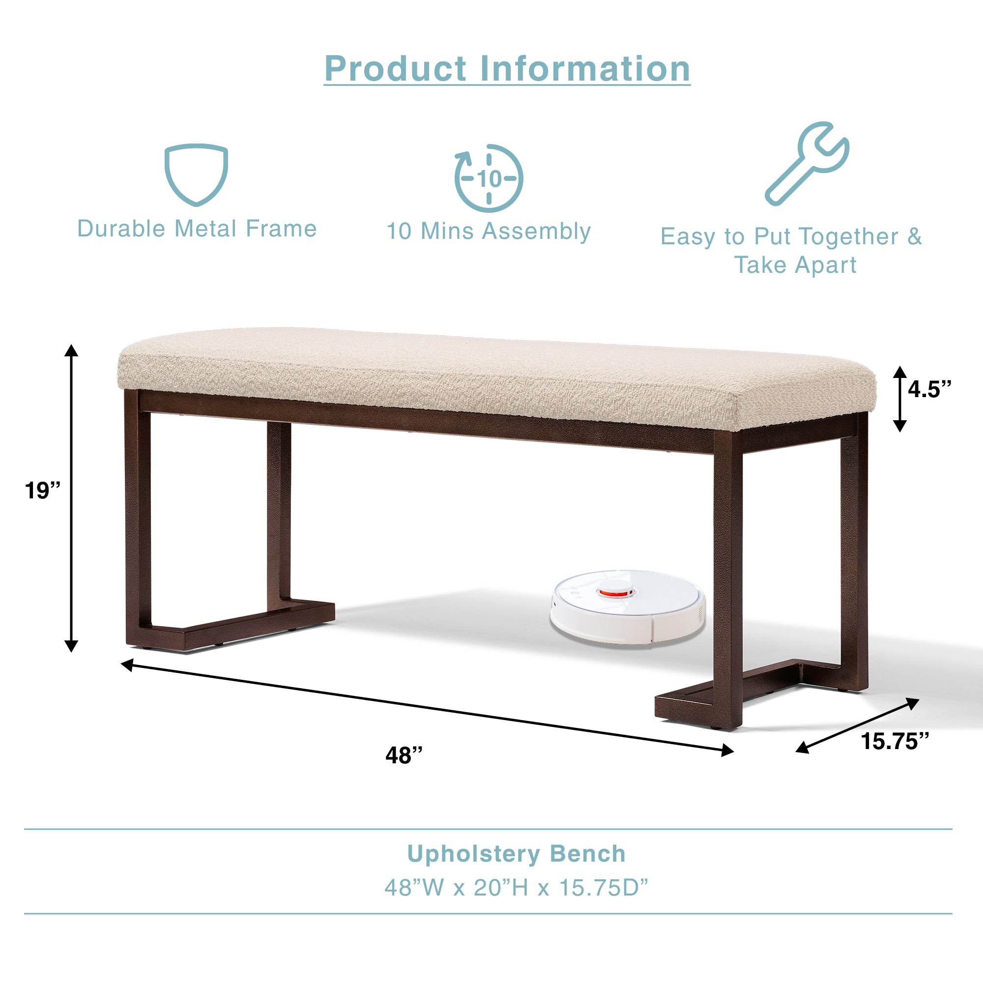 This modern bench combines a sleek metal frame with soft bouclé upholstery for lasting style and comfort. With floor-protecting bumpers, open-base storage, and easy assembly, it’s a versatile piece for any room.