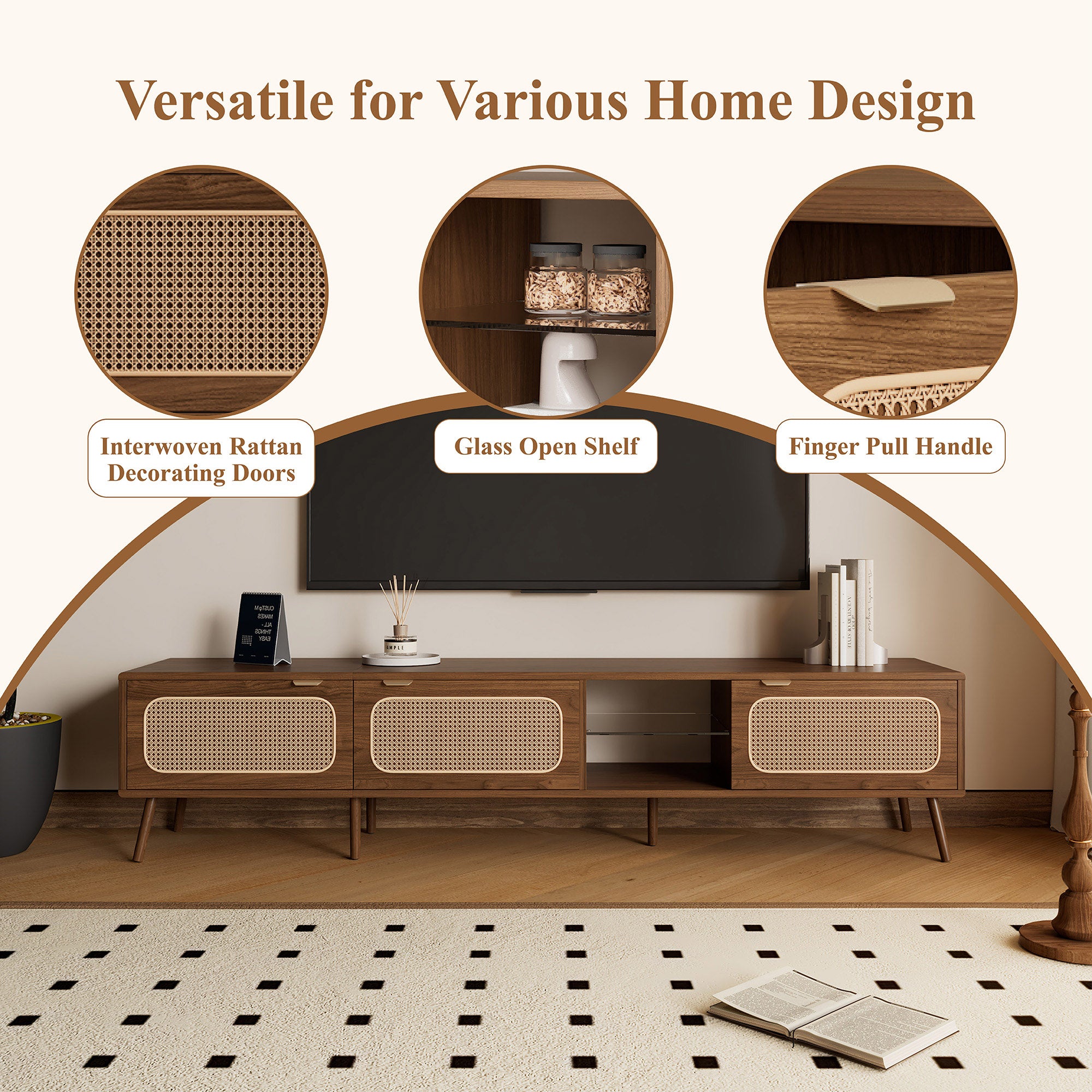 The 78" TV Stand is designed to support TVs up to 85'', offering a sleek centerpiece for living rooms or bedrooms. With open shelving and ample storage, this modern console keeps media devices and essentials organized with effortless style.