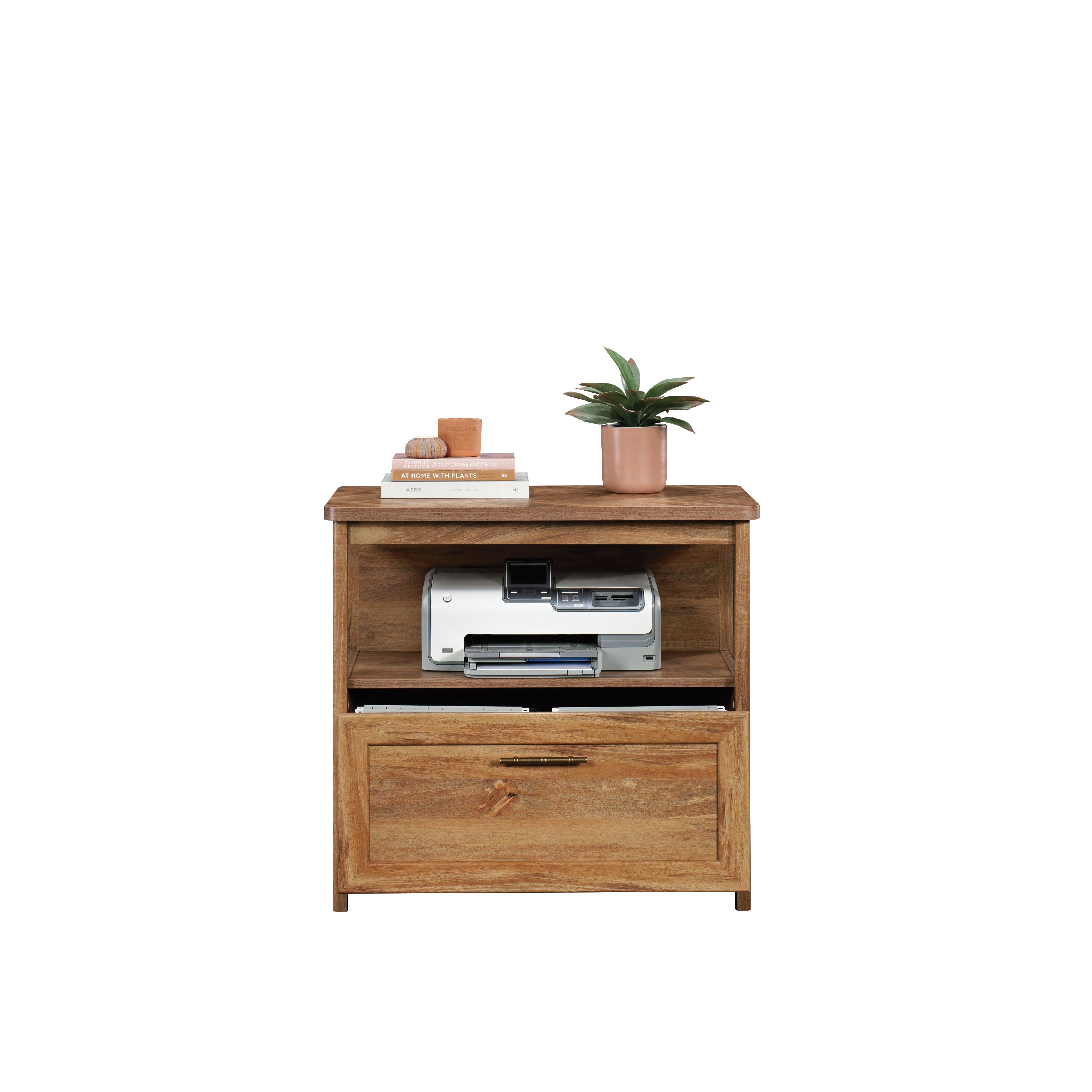 An elegant blend of function and style, featuring a full-extension file drawer, open shelf for books or décor, and a warm brown finish with herringbone detailing. Finished on all sides for flexible placement.