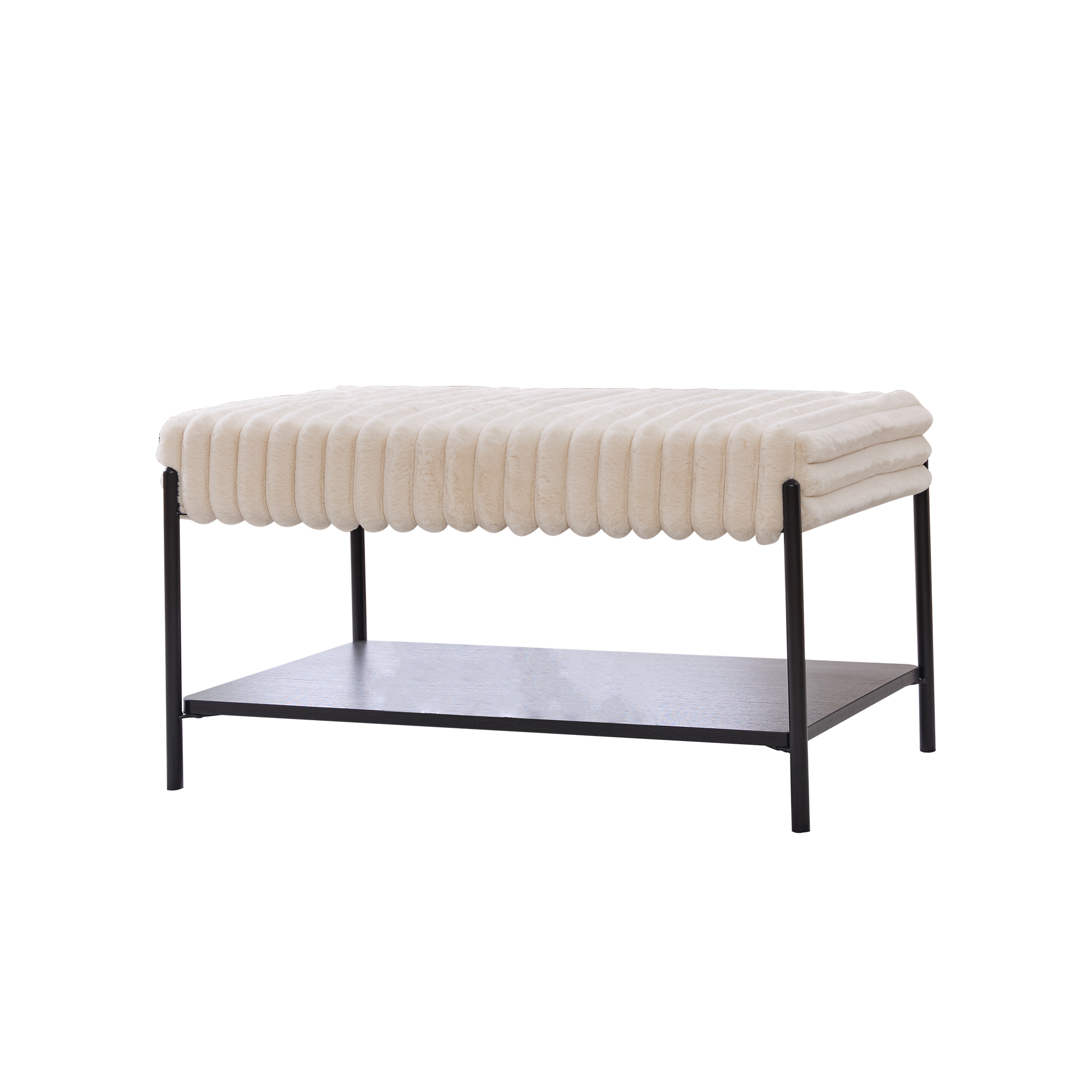 Soft upholstered ottoman with sturdy metal legs and a lower open shelf for books, baskets, or slippers. Versatile as extra seating, a footrest, or a coffee table, it blends comfort and modern style for any room.