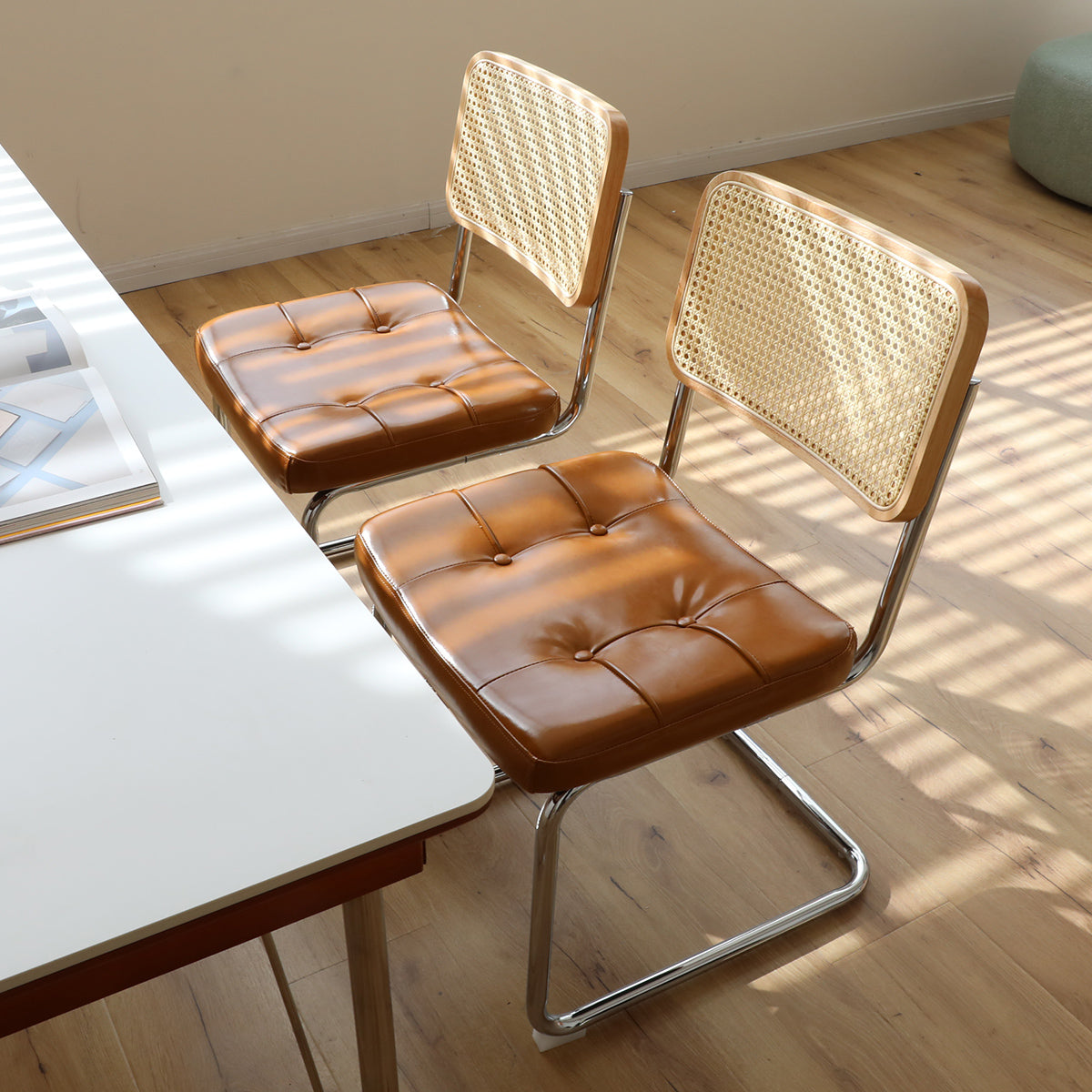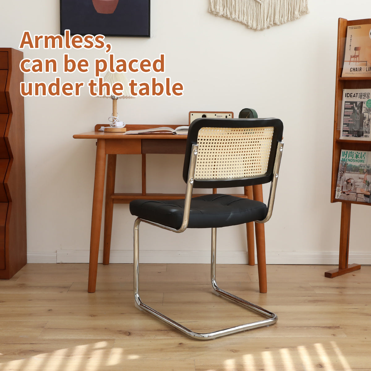 This set of 2 dining chairs channels mid-century Breuer design with a modern twist. Featuring woven rattan backs, faux leather seats, and sleek chrome legs, they blend comfort with timeless style—perfect for the dining room, kitchen, or living space.