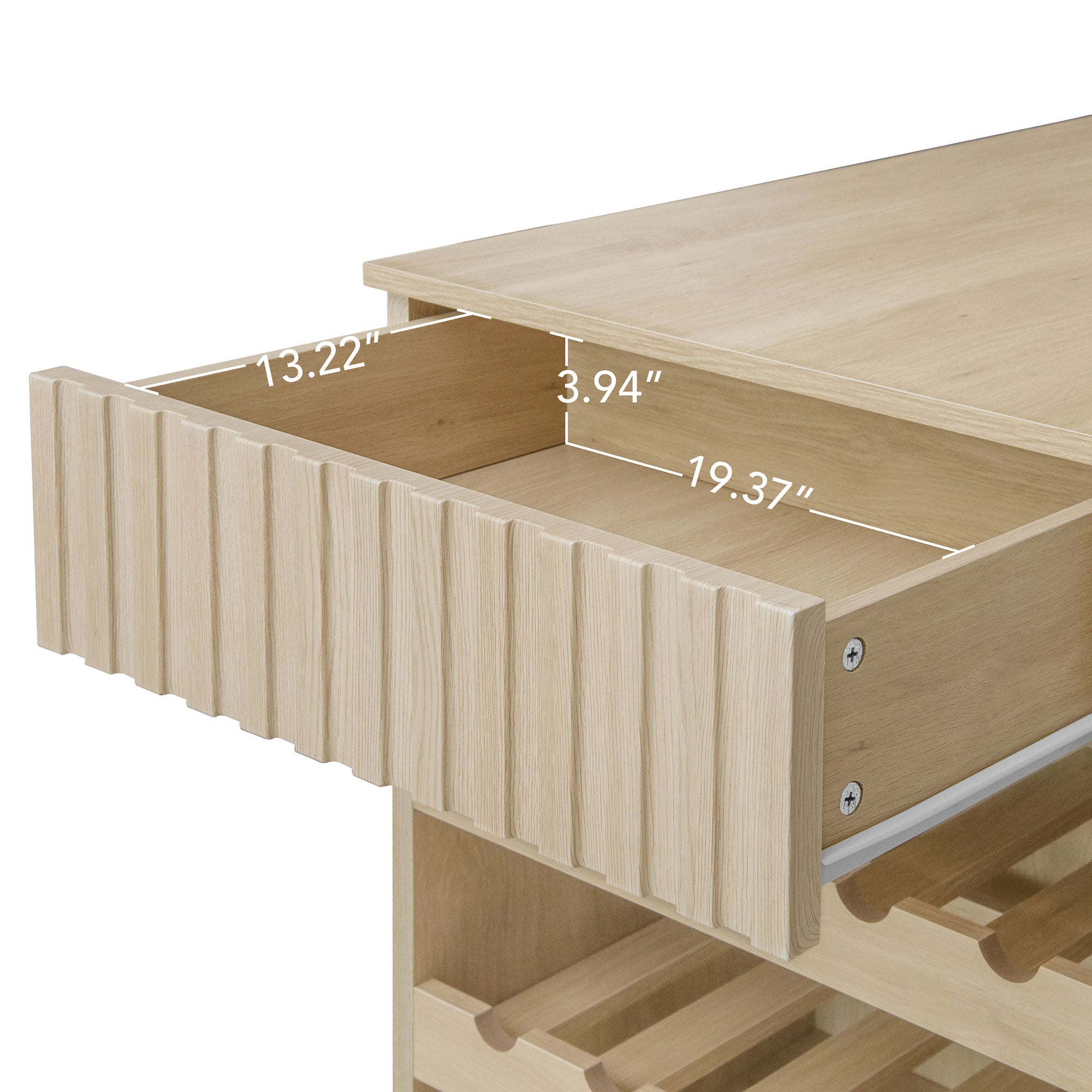 A compact kitchen island cart with fluted detailing, smooth drawer, wine racks, and adjustable shelves. With a spacious top and locking wheels, it brings storage, mobility, and modern style to any space.
