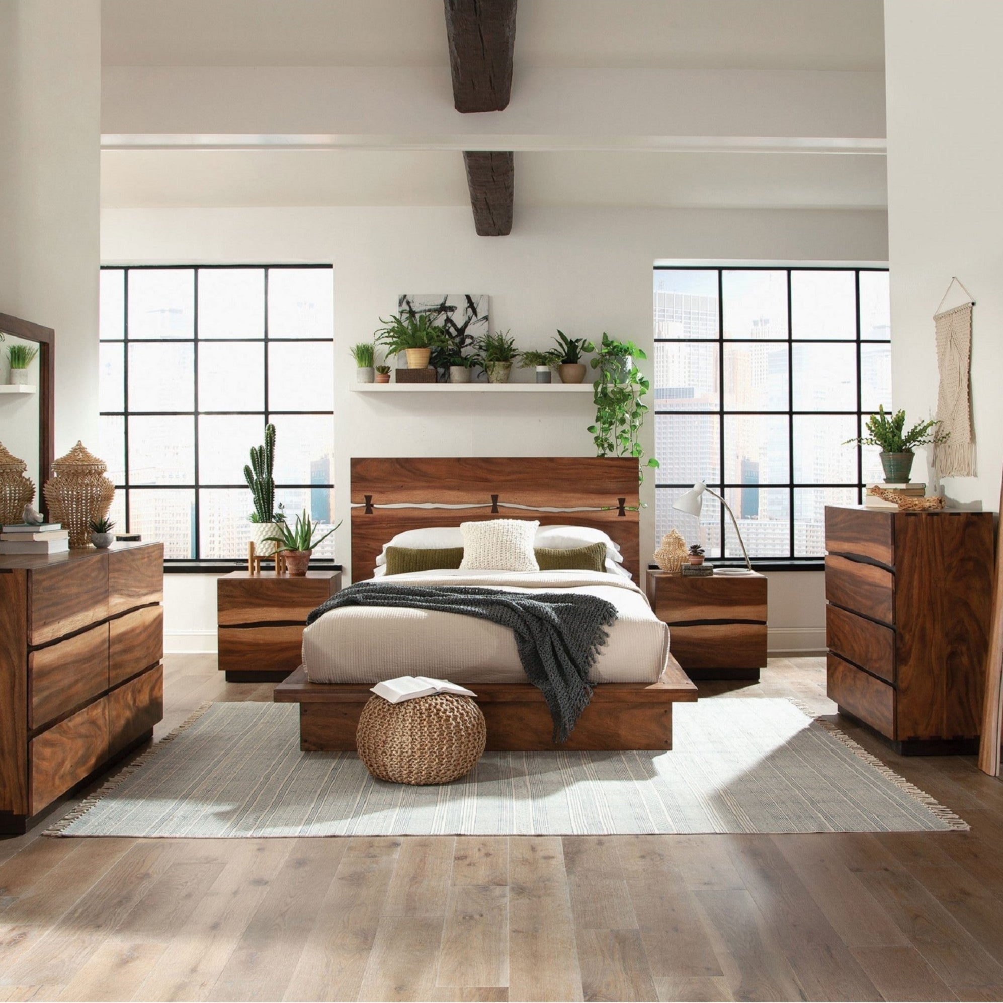 Update your personal space with the intriguing style of this wooden nightstand. Its frame sits atop a sturdy base with an attractive, dark finish. Its body and surface boast a striking smoked walnut and coffee bean finish. One edge of each drawer is crafted with an artsy, asymmetrical design and a cool, faded look, giving it a modern edge.