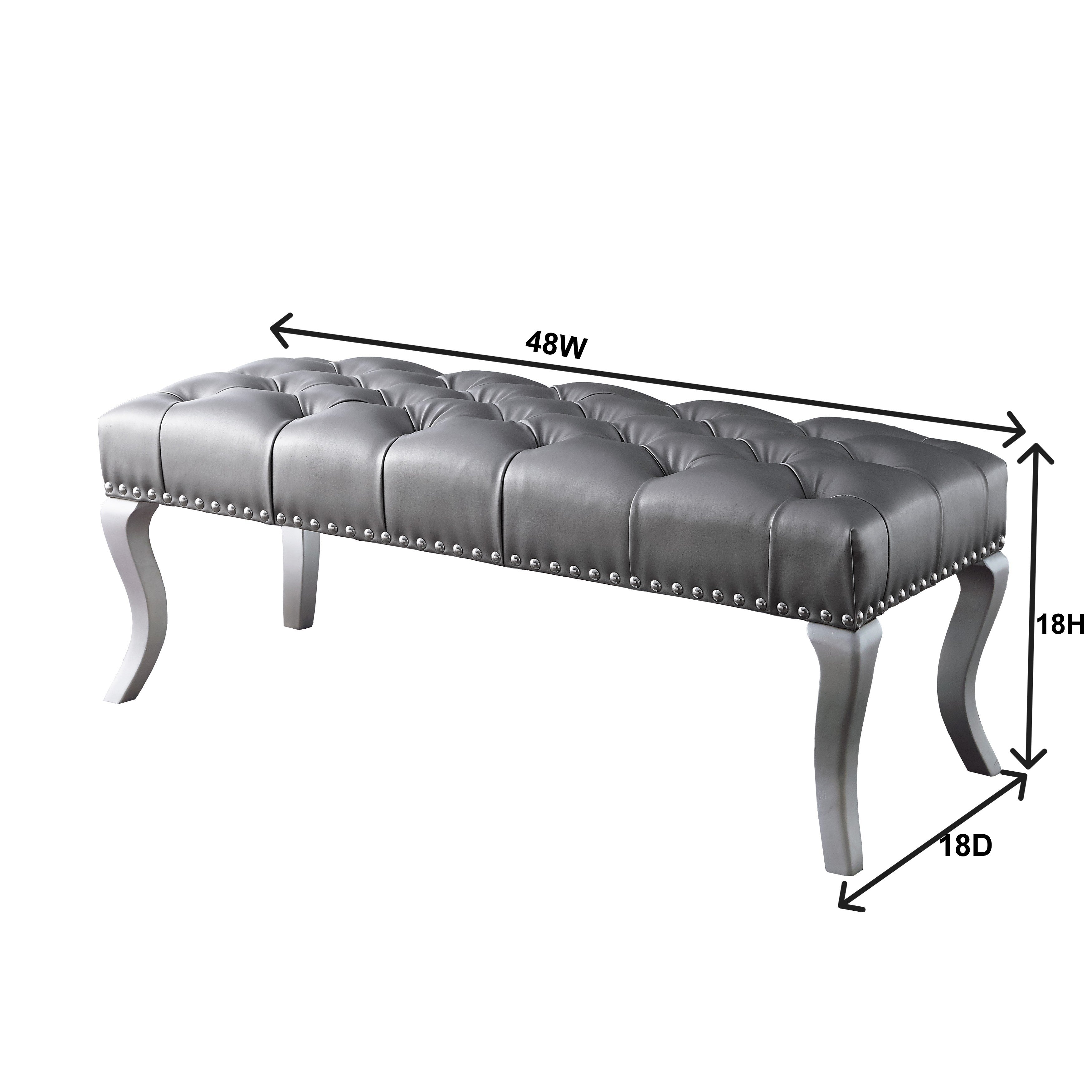 Soft gray velvet bench with faux crystal tufting, nailhead trim, and champagne-finished curved wood legs. A touch of modern luxury for any room. Dimensions: 48"W x 18"L x 18"H. Assembly required.