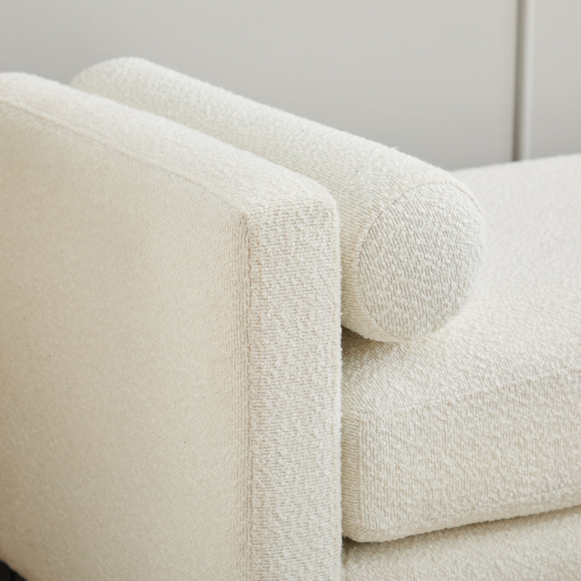 Bouclé upholstery and round bolster pillows lend this bench a modern, cozy look. With plush comfort, natural wood legs, and versatile use, it’s perfect for the entryway, living room, or end of bed.