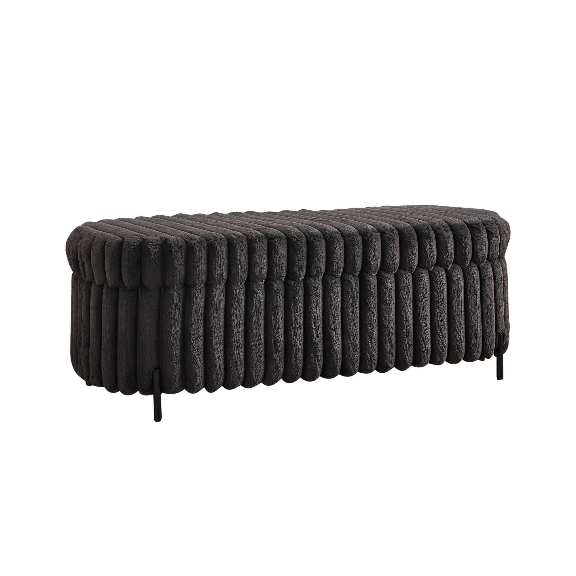 Curved storage bench wrapped in soft faux fur with a plush seat and hidden compartment. Its graceful silhouette and ample storage make it a versatile accent for bedrooms, living rooms, or entryways.