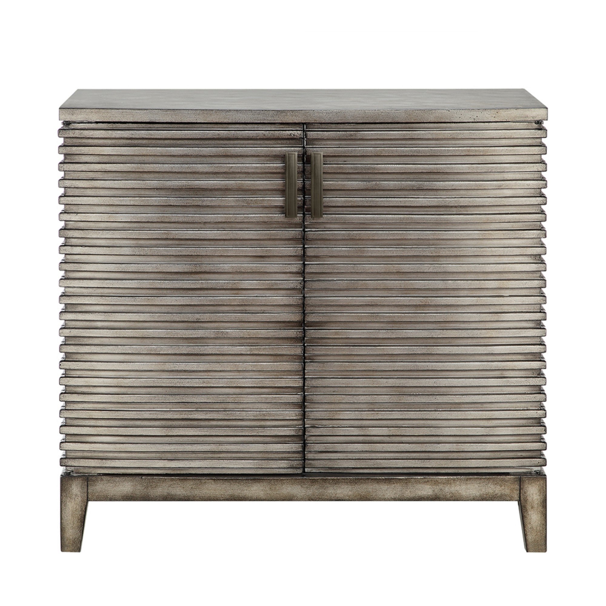 The Vintage Accent Cabinet adds rustic sophistication to any room with its linear grey design. Crafted from engineered wood, it features two doors revealing spacious shelves for versatile storage. No assembly required for effortless placement.